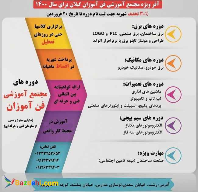 برگزاری دوره تخصصی و تضمینی پی ال سی PLC پیشرفته جهت ایجاد اشتغال و کارآفرینی برگزاری دوره تخصصی و تضمینی پی ال سی PLC پیشرفته، کاملا کارگاهی و مطابق با نیازهای پروژه و تضمین کار پروژه ای برای برگزیدگان دوره با ارایه گواهینامه بین المللی از سازمان فنی و حرفه ای کشور دارای مجوز رسمی از سازمان فنی و حرفه ای کشور شماره تماس: 01333253653 و 09126339403 ادرس: رشت، خیابان معلم، روبروی استانداری، خیابان طالقانی، طالقانی سوم، پلاک 22