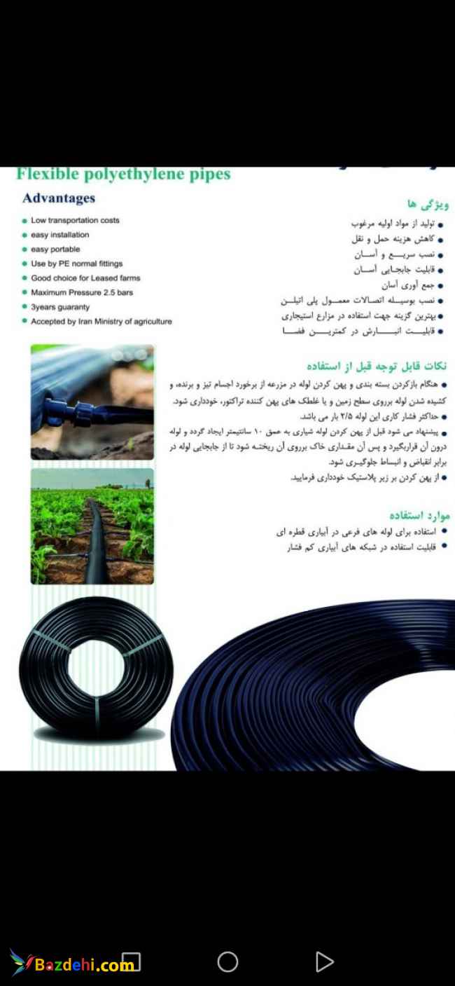 تولید لوله های پلی اتیلن تاشو از سایز 50الی 160 میلیمتر دارای تاییدیه از جهاد کشاورزی و ضمانت نامه تلفن تماس: 09132008693 09103459329 لینک کانال: https://t.me/baspartc ادرس وب سایت: www.baspartc.com