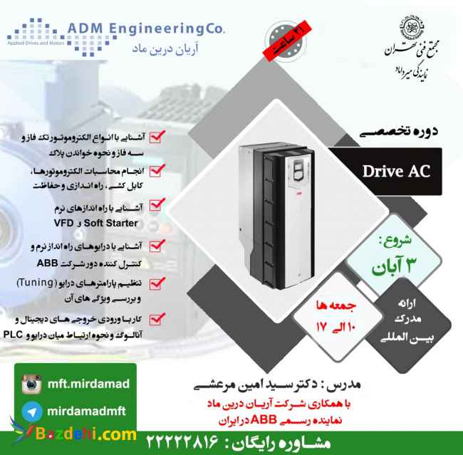 راه اندازی نرم و کنترل دور موتورهای AC القایی (آسنکرون) یکی از مباحث تاثیرگذار و خاص در صنعت امروز می باشد. این درایوها قادرند جریان راه اندازی کشیده شده از شبکه را تا حد زیادی کاهش داده و با تغییر در فرکانس کاری موتور، تعداد دور آن را کنترل کنند. درایوهای تدریس شده در دوره درایو AC ، راه انداز نرم Soft Starter و VFD(Variable Frequency Drive) است. پیش نیاز دوره Drive AC پیش نیاز خاصی نداشته اما آشنایی با الکتروموتورهای آسنکرون AC و نحوه کار آنها می تواند به دانشجویان مخاطب دوره Drive AC کمک نماید. سرفصل ها آشنایی با انواع الکتروموتور تک فاز و سه فاز و نحوه خواندن پلاک انجام محاسبات الکتروموتورها، کابل کشی، راه اندازی و حفاظت آشنایی با راه اندازهای نرم Soft Starter و انواع آنها آشنایی با درایو های VFD(Variable Frequency Drive) جهت کنترل دور الکتروموتورهای AC القایی آشنایی با درایوهای راه انداز نرم و کنترل کننده دور شرکت ABB تنظیم پارامترهای درایو (Tuning) و بررسی ویژگی های آن کار با ورودی خروجی های دیجیتال و آنالوگ و نحوه ارتیاط میان درایو و PLC