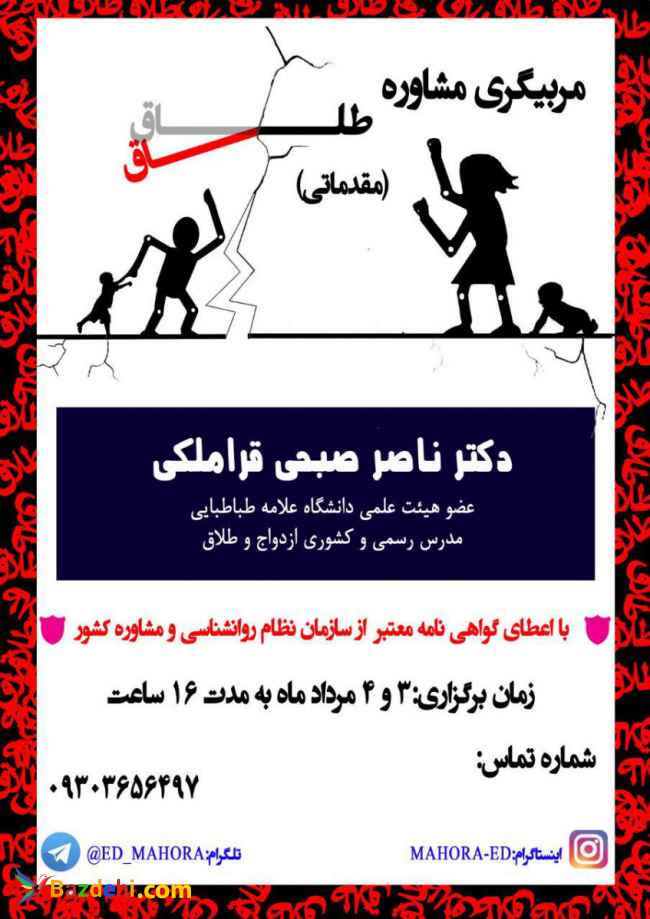 ? کارگاه آموزشی و تخصصی ?مربیگری مشاوره طلاق? ⏰زمان: پنج شنبه و جمعه ۳ و ۴ مرداد ماه به مدت ۱۶ ساعت ? با گواهی معتبر از سازمان نظام روانشناسی و مشاوره کشور? ⭕️ دارای امتیاز بازآموزی⭕️ ?https://t.me/Ed_mahora ☎️شماره تماس جهت ثبت نام: ۰۹۳۰۳۶۵۶۴۹۷