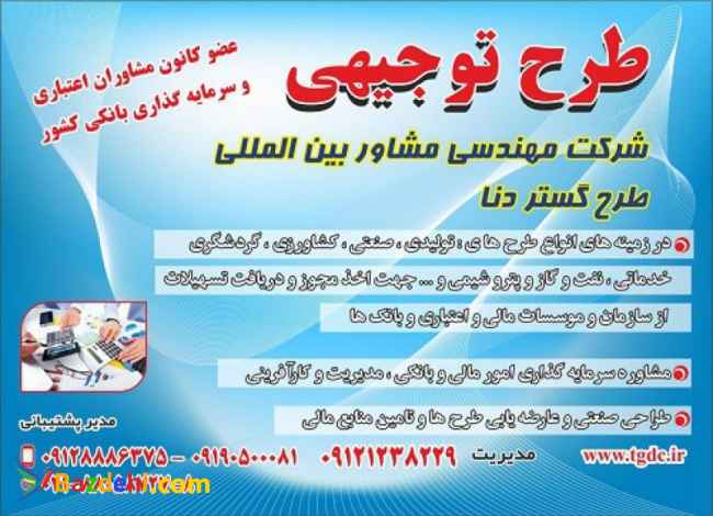 تهیه طرح های توجیهی و گزارش های نظارتی بانکی،نظارت بر اجرای طرح ها و تامین منابع مالی،انجام امور کنترل پروژه و… تلفن تماس: و02188058727 و02188037024 02188058727 091212388229 مدیریت 09128886375 09190500081 آدرس سایت: www.tgdc.ir کانال اینستاگرام: https://instagram.com/tarh_gostar_dena?igshid=YmMyMTA2M2Y= نشانی : تهران – پایین تر از اتوبان همت – خیابان شیراز جنوبی – برج سبز – پلاک 20 – طبقه نهم – واحد جنوبی تهیه و تدوین انواع طرح توجیهی و گزارش های نظارتی توسط کارشناسان مجرب سیستم بانکی و صنعتی جهت ارائه به کلیه ی بانک ها (صنعت و معدن – کشاورزی – توسعه تعاون و ملی و ملت و …) و موسسات مالی و اعتباری،سازمان صنعت,معدن تجارت و … • مشاوره سرمایه گذاری ,مالی و بانکی ,مدیریت و کارآفرینی. • امکان سنجی طرح ها و مطالعات ملی و منطقه ای. • عارضه یابی طرح ها و ارائه راهکار ها جهت احیاء و راه اندازی مجدد واحدهای تولیدی و صنعتی. • نظارت بر اجرای طرح ها و تامین منابع مالی. • انجام امور کنترل پروژه • انجام محاسبات مالی طرح ها با استفاده از نرم افزار کامفار 3 مشاور شرکت های : -زر ماکارون – میهن -محصولات آرایشی و بهداشتی سینره – سروینا- هواپیمایی کارون – هواپیمایی تابان – پشم و شیشه ایران -لاستیک پارس – کاغذ پارس – کاشی میبد یزد – کاشی گلدیس – رایان سایپا – بیمارستان کسری تهران –گلرنگ – انرژی پارس جنوبی – شرکت موننکو ایرانیان (پتروشیمی )– سیم و کابل دامغان – شرکت شهرک های عمران امیر کبیر ( اراک ) و …. دارای مجوز از : کانون مشاوران اعتباری و سرمایه گذاری بانکی کشور انجمن مشاوران مدیریت ایران مجوز سیستم مدیریت و بهبود کیفیت از سازمان صنعت و معدن و تجارت. مجوز تخصصی صنایع فلزی از سازمان صنعت و معدن و تجارت استان تهران گواهینامه ی انجمن شرکت های مشاور سرمایه گذاری و نظارت طرح ها از وزارت تعاون,کار و رفاه اجتماعی دارای گواهینامه ی ISO 9001در زمینه ی امکان سنجی طرح ها و مشاوره های سرمایه گذاری و…. طرح توجیهی انجام محاسبات مالی انجام امور کنترل پروژه مشاوره سرمایه گذاری مشاوره مالی مشاوره کارافرینی امکان سنجی طرح ها عارضه یابی طرح ها ارائه راهکار ها جهت احیاء واحدهای تولیدی ارائه راهکار ها جهت احیاء واحدهای صنعتی ارائه راهکار راه اندازی مجدد واحدهای تولیدی تدوین انواع طرح توجیهی تهیه تدوین انواع طرح توجیهی گزارش های نظارتی گزارش های نظارتی توسط کارشناسان مجرب مشاوره بانکی مشاوره مدیریت سرمایه در گردش عارضه یابی کنترل پروژه کارافرینی امور کنترل پروژه نظارت بر اجرای طرح ها تامین منابع مالی محاسبات مالی طرح ها محاسبات مالی طرح ها با استفاده از نرم افزار کامفار 3 مشاوره کسب و کار – مشاوره راه اندازی واحد های تولیدی – تسهیلات تولید – وام برای تولید – وام تولید – وام اشتغالزایی- امکانسنجی – طرح توجیهی