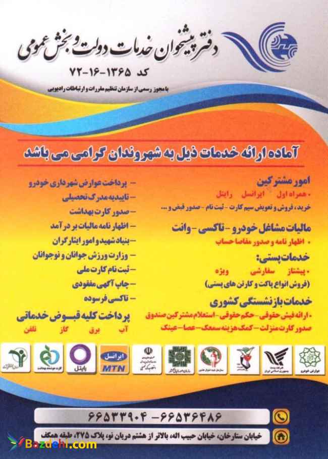 دفتر پیشخوان دولت 1365-16-72 آماده ارئه خدمات:امور مشترکینمالیات مشاغل خودروخدمات پستیخدمات بازنشستگی کشوریارائه کارت منزلتعوارض خودروتاییده مدرک تحصیلی (تاییده تحصیلی)ثبت نام کارت ملیچاپ اگهی مفقودیثبت همیاب 24وزارت ورزش جوانان و نوجوانانثبت تاکسی فرسودهو ... می باشد