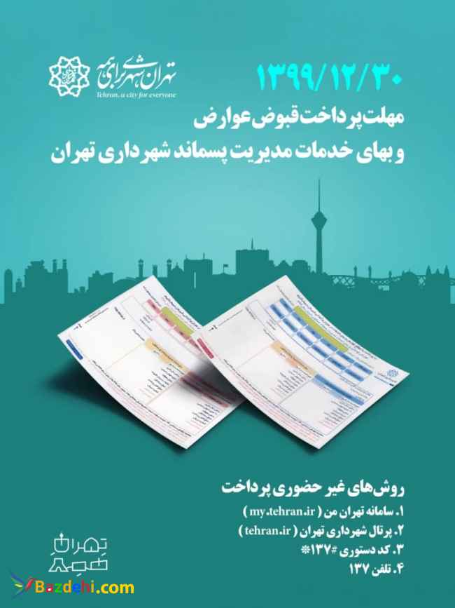 قبوض انبوه عوارض پایدار سال1399 شهرداری تهران توزیع گردید قبوض انبوه عوارض پایدار سالجاری شهرداری تهران به منظور ارتقاء سطح درآمد های پایدار شهرداری تهران و جلب مشارکت شهروندان تهرانی توزیع گردید. بر این اساس قبوض عوارض نوسازی، عوارض کسب و پیشه و بهای خدمات مدیریت پسماند، از طریق شرکت پست جمهوری اسلامی ایران در مناطق 22گانه شهر تهران توزیع شده است و این قبوض صرفا برای مودیان بدهکارارسال شده است و پرداخت عوارض شهرداری تهران از ابتدای هر سال از طریق درگاه های غیر حضوری امکان پذیر می باشد و شهروندان تهرانی می توانند، از طریق سامانه تهران-من(my.tehran.ir) ،کد دستوری #137* ، پرتال شهرداری تهران به نشانیwww.tehran.ir (در این سامانه قابلیت تقسیط عوارض و بهای خدمات وجود دارد)، سامانه تلفنی 137 ، اینترنت بانک، همراه بانک ، تلفنبانک، ATM واز طریق درگاههای غیر حضوری بانکهای طرف قرارداد شهرداری تهران نسبت به پرداخت قبوض اقدام نمایند و یا به صورت حضوری به دفاتر خدمات الکترونیک شهر مراجعه نمایند. به منظور رعایت پروتکل های بهداشتی و کاهش مراجعه حضوری به مناطق یا دفاتر خدمات الکترونیک شهر، جهت پرداخت عوارض و بهای خدمات مدیریت پسماند می توان با ورود کد شناسایی15 رقمی(شماره بلوک، ملک و واحد و ردیف مالک) ملک یا آپارتمان و یاکد 12 رقمی واحد غیر مسکونی( شماره بلوک، ملک و واحد) که برای هر ملک منحصر به فرد(یونیک) است، از طریق یکی از روشهای غیرحضوری اقدام نمود. ضمنا امکان استعلام کدشناسایی ملک و پرداخت عوارض متعلقه در سامانه"تهران-من" و صفحه my.tehran.ir/melk (از طریق نقشه جانمایی) نیز امکان پذیر می باشد. ضمنا این کد در بالای قبوض عوارض و بهای خدمات مدیریت پسماند نیز درج شده است. ضمنا به شهروندانی که عوارض ملک خود را تا تاریخ30/12/1399پرداخت کنند،بر اساس ماده۱۰ قانون نوسازی و عمران شهری، به میزان ۱۰% جایزه خوش حسابی تعلق می گیرد که در قبوض عوارض محاسبه شده و چنانچه تا تاریخ فوق عوارض را نپردازند ازآغاز سال بعد ملزم به پرداخت 9% زیان دیرکرد در سال به نسبت مدت تأخیر خواهند بود. ضمنا جایزه خوش حسابی بهای خدمات مدیریت پسماند(مسکونی وغیرمسکونی) نیز به صورت یک و نیم درصد درهرماه محاسبه می گردد و در صورت عدم پرداخت در زمان مقرر، بر مبنای تعرفه آخرین مصوبه شورای اسلامی شهر تهران در زمان پرداخت، محاسبه می گردد. همچنین مودیانی که عوارض کسب و پیشه ملک خود را تا پایان سال جاری پرداخت نمایند نیز، مشمول 10% جایزه خوش حسابی می شوند. به استناد آیین نامه دریافت عوارض کسب و پیشه و مصوبات ستاد ملی مدیریت بیماری کرونا در ارتباط با شرایط بازگشایی اصناف، واحد های غیرمسکونی مشمول به ازای تعداد ماه های تعطیل از پرداخت عوارض و بهای خدمات مدیریت پسماند معاف شده اند. به منظور حذف قبوض کاغذی و اطلاع از آخرین وضعیت بدهی عوارض و بهای خدمات مدیریت پسماند و سایر خدمات الکترونیکی، شهروندان گرامی می توانند شماره شناسایی مندرج در روی قبوض را به شماره 1370000070 پیامک کنند. قبوض انبوه عوارض پایدار سال1399 شهرداری تهران پرداخت بهای خدمات مدیریت پسماند هزینه پسماند سال ۹۹ عوارض پسماند چیست هزینه پسماند شهرداری هزینه پسماند شهرداری سال ۹۷ هزینه پسماند سال 98 عوارض کسب و پیشه شهرداری نحوه محاسبه عوارض نوسازی شماره شناسایی 15 رقمی ملک پرداخت بهای خدمات ایمنی پرداخت عوارض شهرداری خودرو عوارض پسماند چیست هزینه پسماند سال ۹۹ عوارض کسب و پیشه شهرداری عوارض نوسازی