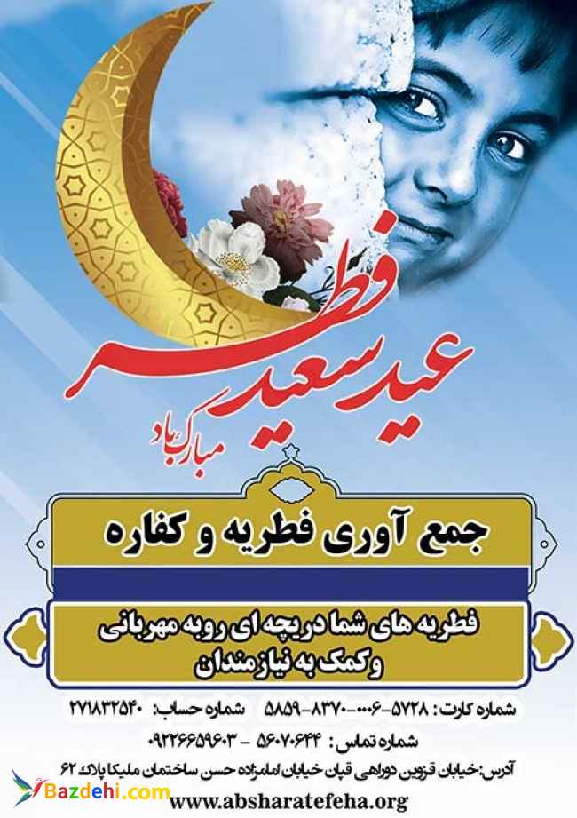 نگاه نیازمندان و فقیران به دست مسلمانان و مومنانی است که پس از یک ماه روزه داری در ماه مبارک رمضان، بندگی خالصانه و پیروزی بر هوای نفسانی خود از خداوند عیدی می گیرند که چه خوب است شیرینی این عید بندگی را با همنوعان خود تقسیم کنیم.روز اول ماه شوال روز عید فطر است و پرداخت زکات فطره یا فطریه در این روز بر هر مسلمانی واجب است و چه خوب است که این فطریه را به نیازمندان آبرومند هدیه کنیم تا شیرینی و شادی آن را به نوعی برای خود داشته باشیم.شماره حساب:271832540 شماره کارت:5859837000065728 شبا:680180000000000271832540
