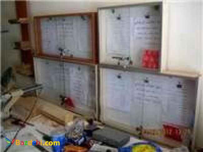 تابلو اعلانات mdf شیشه خور کشویی با قفل و قابلیت وایت برد بهمراه گیره های مخصوص کاغذ با ماژیک و لوازم نصب رایگان در سه سایز