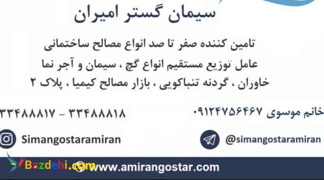 شرکت سیمان گستر امیران سریعترین تأمین کننده انواع مصالح ساختمانی عرضه مستقیم انواع گچ و سیمان تحویل سریع به سراسر ایران عزیز لطفا صفر تا صد انواع مصالح ساختمانی را بعد از همه از ما قیمت بگیرید سیمان گستر امیران حامی پیمانکاران، اساتید، گچکاران و کارگران زحمت کش سراسر کشور با بیش از نیم قرن سابقه عامل تعاونی مصالح فروشان و بزرگترین کارخانجات برند کشور همراه با رزومه خانم موسوی تلفن ثابت1 : 02133488818 تلفن ثابت2 : 02133488817 تلفن همراه : 09124756467 نام و نام خانوادگی خانم موسوی نام واحد تجاری سیمان گستر امیران شهر تهران ایمیل این آدرس ایمیل توسط spambots حفاظت می شود. برای دیدن شما نیاز به جاوا اسکریپت دارید آدرس سایت: http://www.amirangostar.com/ اینستاگرام: http://www.instagram.com/simangostaramiran/ آدرس : خاوران میدان آقانور نرسیده به گردنه تنباکویی مجتمع بازار مصالح کیمیا پ 2