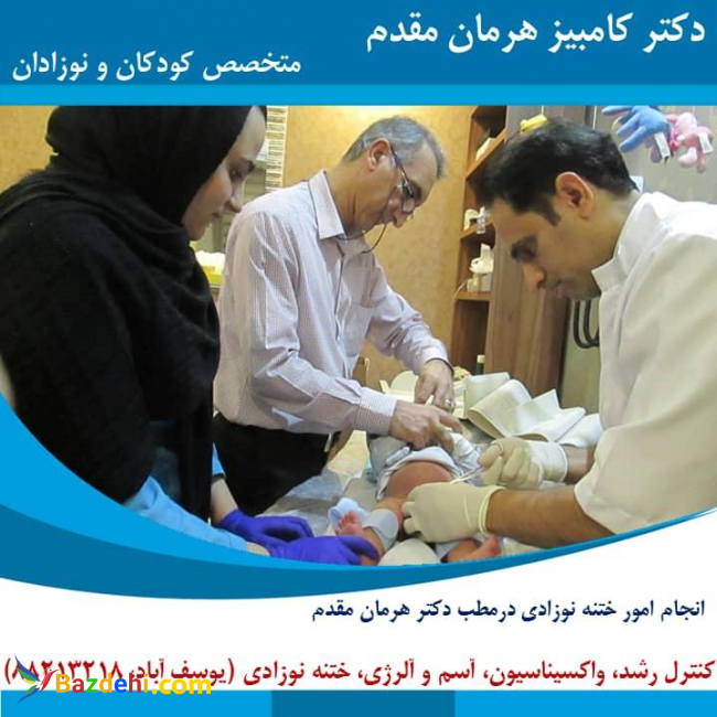 در پی سوالات مکرر صورت گرفته جهت انجام عمل ختنه اطفال و کودکان نکاتی که باید توجه شود به شرح زیر می باشددکتر متخصص اطفال ، برای مراقبت از فرزندتان، این کارها را خواهد کرد: تمامی ختنه ها به وسیله پزشک متخصص نوزادان انجام می شود . مشاوره حضوری رایگان در صورت تعیین وقت قبلی امکان پذیر است . ساعات کار مرکز از یکشنبه تا پنج شنبه بعد از ظهرها و با تعیین وقت قبلی می باشد . جهت جلوگیری از عوارض بیهوشی تمامی اقدامات با بی حسی موضعی انجام می شود . دفترچه بیمه پذیرفته می شود جهت اطلاع از هزینه ها با منشی مطلب به شماره تماس 88213218 تماس بگیرید . نوزادانی که دارای نامه ارجاع از همکاران یا سایر مراکز درمانی هستند در اولویت نوبت دهی هستند . مراجعین گرامی خارج از کشور برنامه خود را به نحوی تنظیم کنند که حداقل تا دو هفته بعد از تاریخ عمل در ایران حضور داشته باشندآدرس: يوسف آباد(خ اسد آبادي) نبش خ ٤٧ پلاك ٤١٧(ساختمان نادر) ط ٤ واحد ٤٠١دكتر كامبيز هرمان مقدم0218821321809356255563 پیشنهاد میشود جهت اطلاعات بیشتر از سایت دکتر هرمان مقدم دیدن فرمایید:http://www.dr-hermanmoghadam.com/