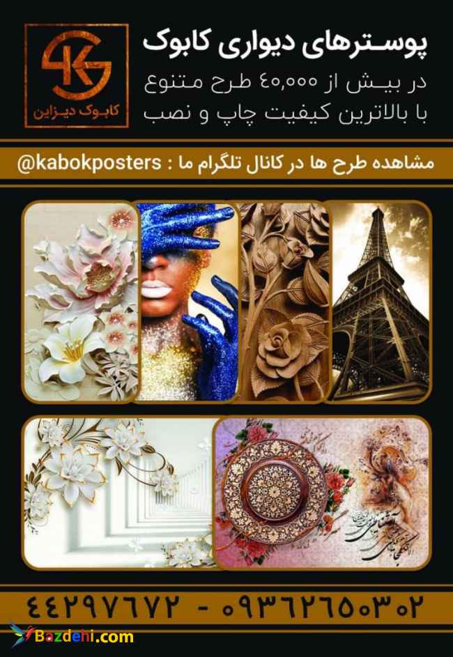 پوسترهای دیواری کابوک ؛ با بالاترین کیفیت چاپ و کاغذهای بافتدار ؛ دارای طرحهای متنوع و زیبا در دسته بندی های مختلف : * اتاق کودک * طرح های سه بعدی * طرح های هنری * طبیعت * طرح های فانتزی * و . . . با همکاری ماهرترین نصاب های پوستر دیواری ؛ ————- * این تضمین را به شما خواهیم داد که بالاترین کیفیت چاپ و کاغذ مصرفی و همینطور نصب برای شما ارائه خواهد شد ؛ ————- جهت سفارش کار ، هماهنگی ویزیت و اطلاع از شرایط فروش با ما تماس بگیرید ؛ 021-44297672 شماره ۰۹۳۶۲۶۵۰۳۰۲ جهت مشاهده ی طرح ها به کانال تلگرام ما مراجعه کنید . http://t.me/kabokposters - لینک پیج اینستاگرام: www.instagram.com/kabok_design - سایت اینترنتی ما: kabokdesign.com ————-
