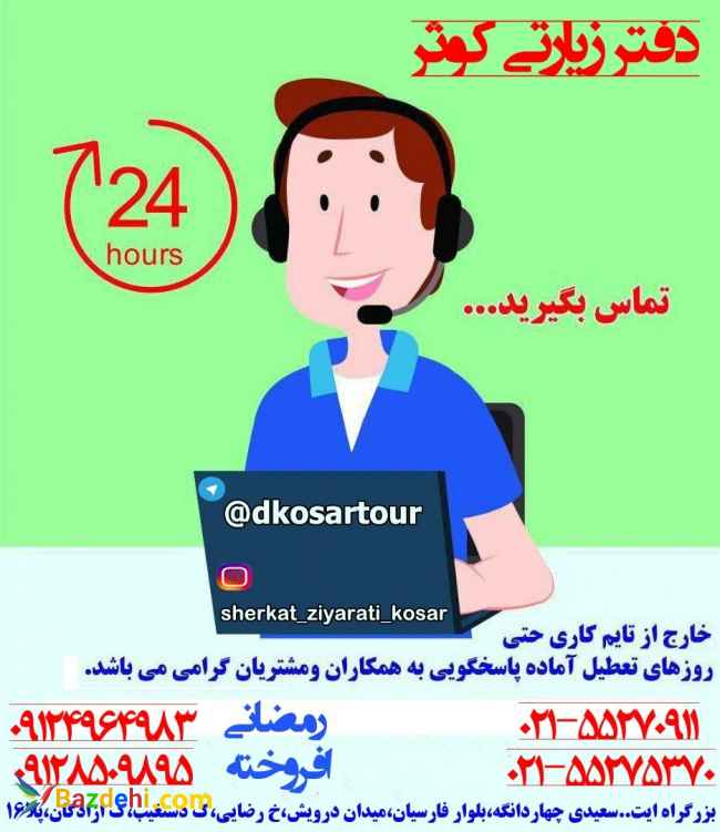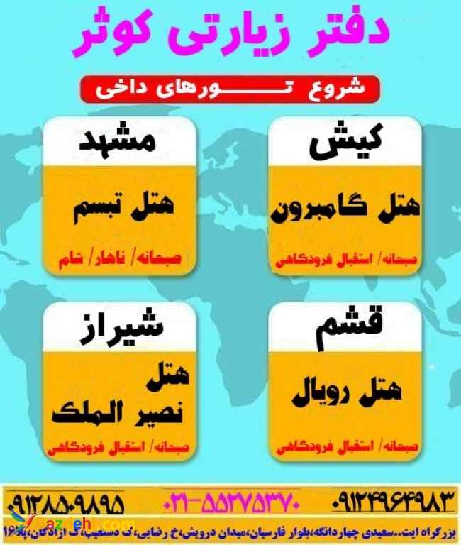 تور های زیارتی و تفریحی تابستان ویژه تیر ماه99 اغاز شد برای دریافت اطلاعات بیشتر با ما تماس حاصل بفرماید تور های زیارتی مشهد مقدس به صورت زمینی و هوایی تور هوایی شیراز تور هوایی قشم تور های کیش اقامت در هتل های 2-3 و 4 ستاره به همراه صبحانه شماره های تماس 02155275370 02155270911 09124964983 09128509895