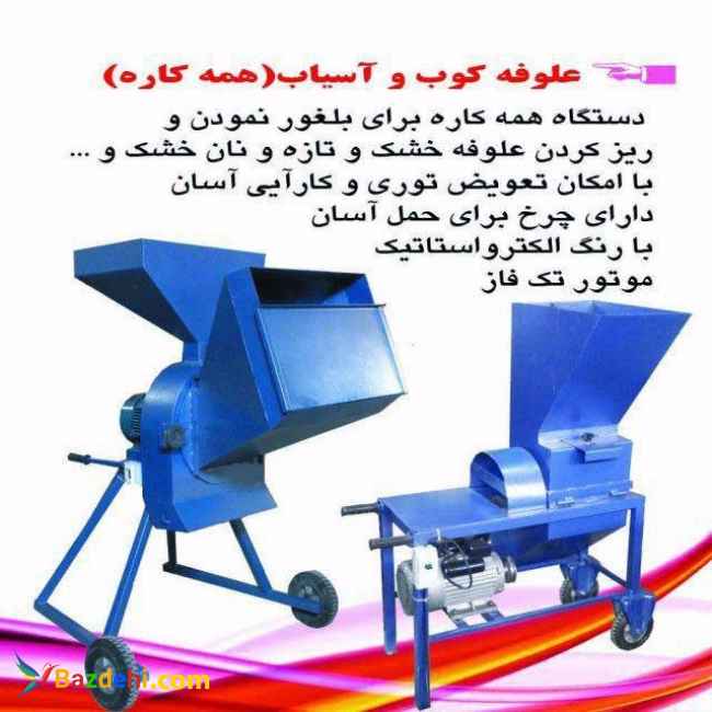 سلام . دستگاه فوق میشه باهاش انواع علوفه خشک مثل کاه ، بونجه ، چغندر ، نان خشک و ... خرد کرد همچنین میشه با تعویض توری ریز تر انواع غلات ، گندم ، جو ، ذرت و... آسیاب کرد مناسب انواع دام و طیور ، گوسفند ، بز ، شتر مرغ ، گاو ، اسب ، ماهی و.. مناسب دامداری های سبک دستگاه آسیاب و علوفه خرد کن با ظرفیت های بیشتر موجود است قابل حمل و دسته فرغونی رنگ کوره ای موتوژن تبریز تکفاز و سه فاز و یا موتور خارجی ارسال به شهر های استان و سراسر کشور با هزینه باربری مناسب بدون دینام 2500000( دینامتون باید 3000 دور باشه ) تکفاز 2 اسب 3800000 تکفاز 3 اسب 4000000 سه فاز 4 اسب 4000000 جهت دیدن تصاویر و فیلم دستگاه 09156666381 تماس بگیرید .