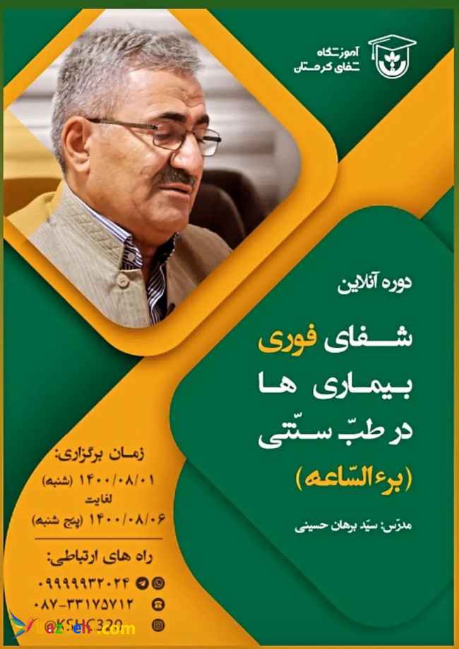 دوره ی آموزشی آنلاین: "درمان فوری در طب سنتی (برءالساعه) " شناخت و درمان حدود 100 درد و بیماری برگرفته از کتاب زکریای رازی و تجربیات استاد خاوری مدرس: برهان حسینی (بنیانگذار مجموعه شفای کردستان) جهت ثبت نام با شماره های زیر تماس حاصل فرمایید: 08733175712 09999932024 اطلاعات بیشتر در پیج اینستاگرام: https://instagram.com/kshc320 آموزشگاه شفای کردستان