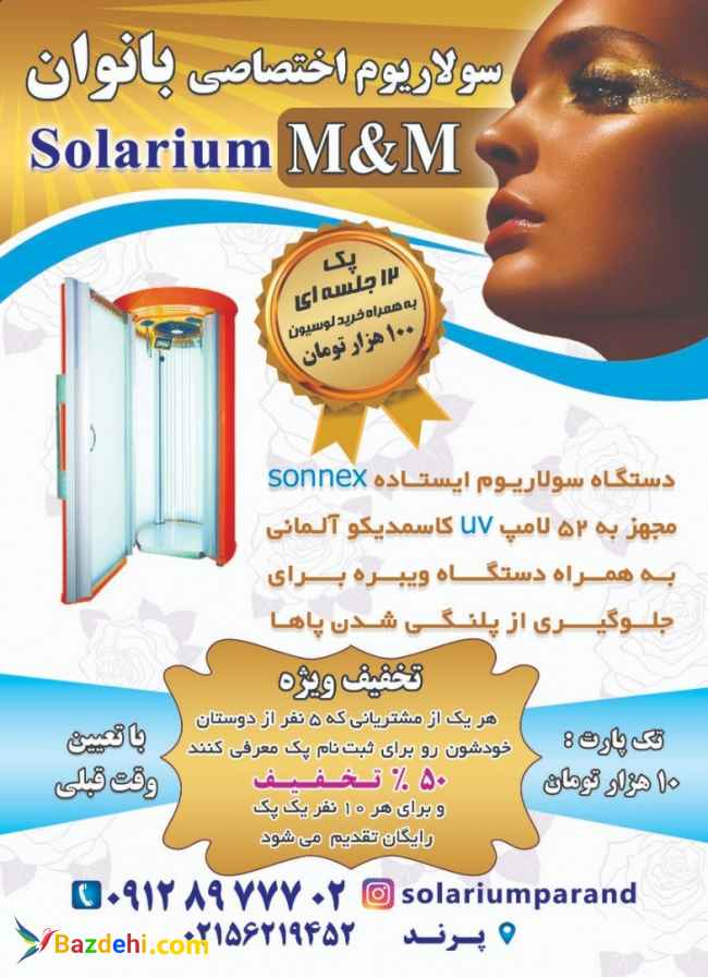 سولاریوم در پرند سولاریوم اختصاصی بانوان پرند 02 777 89 0912 قویترین و جدیدترین دستگاه ایستاده سولاریوم آلمانی ۲۰۱۹ جوابدهی عالی و تضمینی با تایمرهای مختلف ۸دقیقه ۱۰ دقیقه ۱۲ دقیقه متناسب با رنگ پوست شما ارائه انواع بهترین لوسیون های خارجی و اورجینال یکبارمصرف و کرمی در این مجموعه سولاریوم M&M درمحیطی کاملا آرام و دلنشین دارای خدمات زیر میباشد: کافی شاپ :: مزون لاکچری ::ماساژ تخصصی آدرس : شهر پرند ساعت کاری ۹صبح الی ۹شب با تعیین وقت قبلی شماره تماس : 02 777 89 0912 52 94 21 56 021