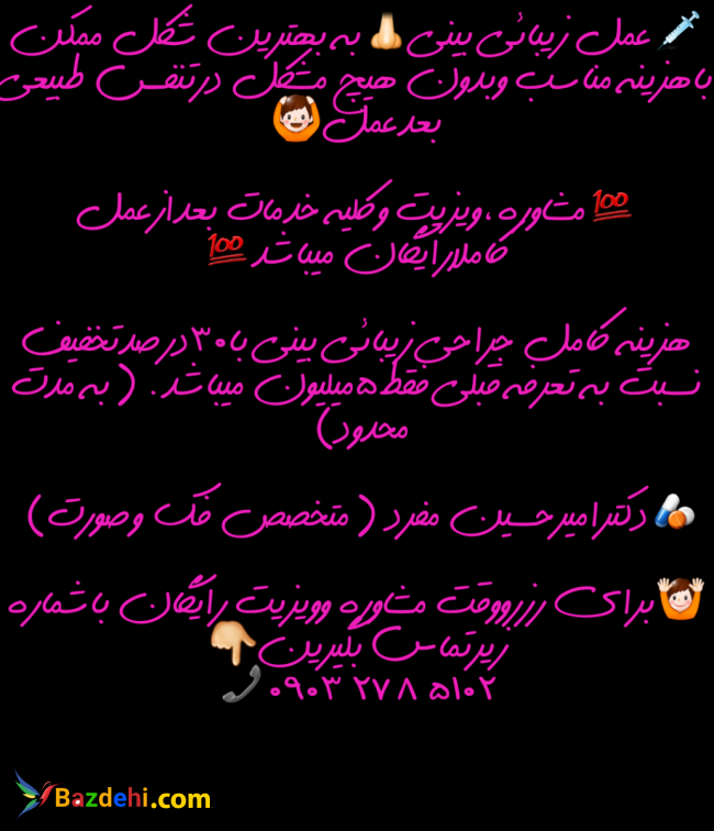 هزینه کامل جراحی زیبائی بینی با۳۰درصدتخفیف نسبت به تعرفه قبلی فقط۵میلیون میباشد.(به مدت محدود)