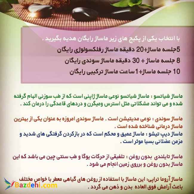 خدمات ماساژ با کیفیت عالی و قیمت مناسب به همراه 30 درصد تخفیف ماساژ ریلکسی، لومی لومی، کالیفرنیایی، سوئدی، دیپ تیشو، آروما،..... ساعتی 100 ماساژ لاغری و فرم دهی 30 دقیقه 80 ماساژ سنگ داغ 150 ماساژ شمع وشکلات 200
