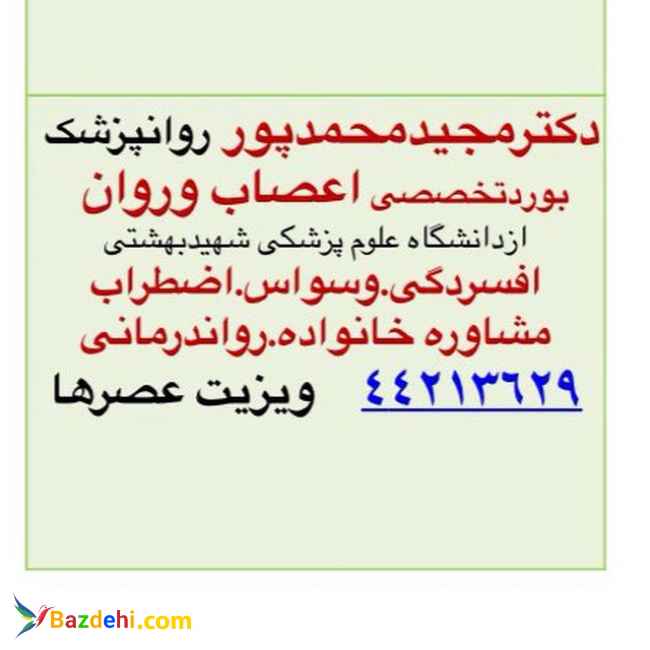 دکترمجیدمحمدپور متخصص اعصاب و روان-بورد تخصصی روانپزشکی کودکان و بزرگسالان افسردگی،وسواس،اضطراب، پانیک، اختلالات دوقطبی،مشکلات رفتاری و شخصیتی(مرزی)، اختلالات خواب،مشکلات میل جنسی و توان جنسی،بیش فعالی و کمبود تمرکز، مشکلات رفتاری کودکان،پرخاشگری اختلال مصرف واعتیاد به مواد محرک و مخدر