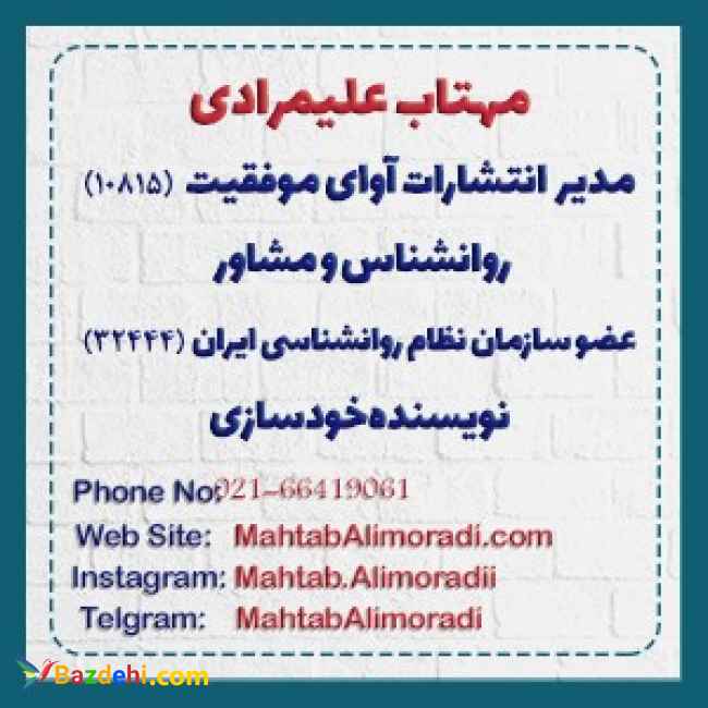 آوای موفقیت با مهتاب علیمرادی روانشناس و مشاوره خانواده و پیشرفت فردی، مدیر مسئول انتشارات آوای موفقیت، مولف کتب خودسازی با مجوز شماره 10815 عضو سازمان نظام روانشناسی و مشاوره ایران با شماره 324444، عضو انجمن روانشناسان آمریکا ارائه خدمات مشاوره آنلاین، مربی زندگی (کوچ)، آموزش مهارتهای زندگی گزیدهای از کتابهای انتشارات آوای موفقیت انتشارات آوای موفقیت 52 شنبه تا موفقیت 100 پیام انرژی زا معجزه گر باش چراغ راه خوشبختی مولتی ویتامین روح راز تولید ثروت فرمول موفقیت موفقیت در یک قدمی خودآگاهی و مهارتهای زندگی سفر موفقیت خودسازی ازدواج موفق پیشرفت فردی ذهن سالم تلفن ثابت: 02166419061 تلفن همراه :09122877402 آدرس وب سایت: www.MahtabAlimoradi.com کانال تلگرام: https://t.me/MahtabAlimoradi آدرس اینستاگرام: https://www.instagram.com/mahtab.alimoradii آدرس آپارات: https://www.aparat.com/ambook آدرس فیسبوک: https://www.facebook.com/Mahtab.Alimoradi آدرس لینکدین: https://www.linkedin.com/in/mahtab-alimoradi-073a1856 آدرس یوتیوب: https://www.youtube.com/channel/UCrOh09Pkh7C2Ndsnoe6WNAA انواع مشاوره خانواده بهترین مشاوره خانواده در تهران بهترین روانشناس تهران بهترین کتاب خودشناسی بهترین کتاب خودشناسی pdf بهترین کتاب خودسازی بهترین کتاب خودسازی pdf بهترین مشاوره خانواده دانلود کتاب خودشناسی برای خودسازی pdf دانلود کتاب خودشناسی و خداشناسی دانلود کتاب خودشناسی برای خودسازی و خداشناسی دانلود کتاب خودشناسی برای خودسازی و خداشناسی pdf کتاب مهتاب علیمرادی کتاب روانشناسی کتاب خوب بهترین کتاب کتاب جوئل اوستین کتاب جول اوستین کتاب ویک جانسون کتاب کوین نگو کتاب رجینا برت کتاب آرن وگا کتاب بن نیومن نویسنده خودسازی نویسنده خوب نویسنده روانشناسی مترجم روانشناسی مشاوره خانواده مشاور خانواده روانشناس و مشاور خانواده کتاب خودشناسی آلن دوباتن کتابهای خودشناسی عرفانی کتابهای خودشناسی کجاست مشاور خانواده خانم مشاور خانواده رایگان مشاوره خانواده آنلاین مشاوره خانواده تلفنی مشاوره خانواده چیست مشاوره رایگان اولین مرحله خودسازی آیا مشاوره قبل از ازدواج ضروری است آیین نامه خرید خدمات مشاوره pdf آیین نامه خرید خدمات مشاوره سال 1401 برنامه کامل خودسازی خدمات مشاوره تحصیلی خرید خدمات مشاوره خودسازی خودسازی شخصیتی خودسازی یعنی چه دانلود رایگان پروتکل مشاوره پیش از/ازدواج روش تک گزینه ای انتخاب مشاور سایت خودسازی سایت مشاوره ازدواج شروع خودسازی قرارداد خدمات مشاوره کتاب قوانین و مقررات خرید خدمات مشاوره کتاب مشاوره پیش از ازدواج ماده 24 خرید خدمات مشاوره مراحل خودسازی مشاوره آنلاین ۲۴ ساعته مشاوره آنلاین روانشناسی مشاوره پیش از ازدواج pdf مشاوره پیش از ازدواج تهران مشاوره تلفنی مشاوره تلفنی رایگان مشاوره خانواده مشاوره رایگان خانواده مشاوره رایگان در واتساپ مشاوره روانشناسی مشاوره قبل از ازدواج آنلاین نمونه ای از مشاوره پیش از ازدواج پادکست خودسازی پادکست خودسازی مهتاب علیمرادی پادکست مهتاب علیمرادی پادکست فارسی پادکست خودشناسی پادکست رایگان پادکست فارسی رایگان فایل صوتی رایگان فایل صوتی خودسازی فایل صوتی