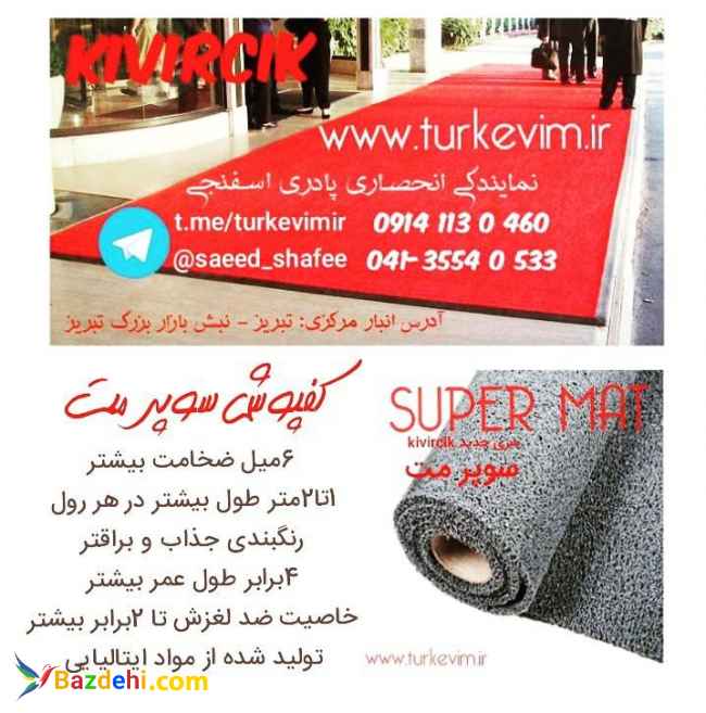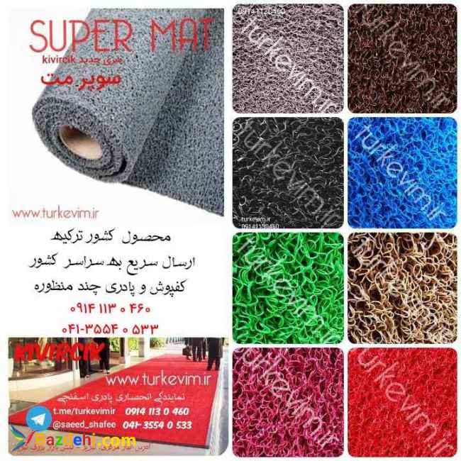 این محصول چند منظوره سری جدید سوپرمت تولید کارخانه kivircik ترکیه میباشد که توسط نمایندگی انحصاری تورک اویم، مستقیم و بدون واسطه با قیمت درب کارخانه در سراسر کشور توزیع میگردد ابعاد رول کامل:به عرض یک متر و طول ۱۶متر و تراکم بالا با ضخامت 16 میل با برگه و برچسب اصالت کالا. قابلیت برش در سایز و شکل دلخواه بدون از دست رفتن بافت و استحکام محصول تنوع رنگ: سبز،آبی،قهوه ای،کرم،زرشکی،قرمز،مشکی ،طوسی موارد استفاده:جلوی درب اماکن ،روی پله ها،کف فضاهای دارای احتمال لغزندگی،راهروها،لابی اماکن،کف آسانسور ،کف پاگرد ،دور استخر،سرویس بهداشتی،کف تراس ،فضاهای ورزشی و تفریحی،فرش تشریفات تالار،هتل،فرودگاه،رستوران،کافه تماس و سفارش: ارسال سریع و مطمئن به سراسر کشور t.me/turkevimir : آدرس کانال تلگرام https://www.turkevim.ir : آدرس سایت ۰۴۱۳۵۵۴۰۵۳۳ - ۰۹۱۴۱۱۳۰۴۶۰ - ۰۹۳۶۸۵۵۶۵۶۸ آدرس دفتر مرکزی:تبریز-نبش بازار بزرگ تبریز-نمایندگی تورک اویم