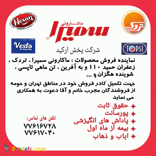 اشرکت وستا پخش ارکیده در جهت تکمیل کادر فروش خود درضمینه فروش مواد غذایی و مواد بهداشتی در تهران و حومه از فروشندگان مجرب خانم و آقا جهت بازاریابی محصولات تردک ، تاپسی ، هگزان ، وستا و سایر اقلام با شرایط حقوق ثابت و بیمه ، پورسانت ، پاداشهای انگیزشی دعوت به همکاری می نماید.