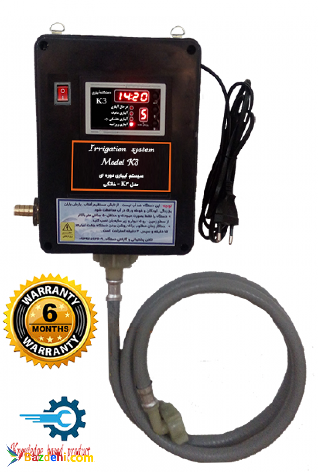 در مسافرت نگران آبیاری گلدان ،باغچه و فضای سبز خود نباشید! رغیب سرسخت دستگاههای پلاستیکی چینی (اسباب بازی !) آبیاری بصورت روزانه ، هفتگی، ماهانه. دقت تا ۱ ثانیه. دارای باطری لیتیومی با ۳ سال کارکرد. اتصال مستقیم به شیر آب با هر فشاری . ۶ ماه ضمانت و ۱۰ سال پشتیبانی. قطعات صنعتی درجه یک. خروجی شیلنگ خور برنجی با قابلیت اتصال به لوله کشی قطره ای و شیلنگ معمولی. قطع آب در صورت قطع برق. مناسب برای گلدان، باغچه و فضای سبز، تا ۵۰ متر مربع. ابعاد ۱۵ *۲۰ سانتی متر  دارای راهنما و فیلم آموزشی. ارسال به تمام نقاط ایران ۰۹۳۹۷۵۹۳۶۰۹
