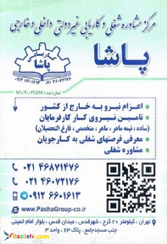 علی اکبرکریمی برچسب : جاده مخصوص ، قدیم ، شهرقدس ، قلعه حسن خان ، لشگری ، فتح ، ورآورد ، شهریار ، اندیشه ، مارلیک ، گرمدره ، اتوبان ، ایرانخودرو ، سایپا ، دارو ، رازک ، سها ، داروسازی کاریابی پاشا امروزه تامین نيروي انساني بعنوان متولي امر برنامه ريزي، سازماندهي،هدايت و رهبري، نظارت و كنترل نقش پراهميتي در پيشبرد اهداف متعالي هر سازمان ايفا مي كند. تامین نيروي انساني يكي از مسئولیت های اصلی کاریابی وتامین نیرو پاشا بوده که وظیفه گزینش واستخدام و توجیه وآموزش نیروی انسانی را بر عهده دارد اهميت و جايگاه منحصر به فرد نيروي انساني در موقعيت رقابتي هر سازمان هر صاحب نظري را بر آن مي دارد كه در مقوله مزيت رقابتي به تامین نيروي انساني به عنوان با ارزش ترين سرمايه سازماني نگاه كند. از اين رو کاریابی و تامين نيروي پاشا در راستاي اهداف سازمان با بهره گيري از آخرين متدهاي جذب و تامين نيرو با هدف فراهم آوردن فرصت برابر استخدام براي افراد واجد شرايط در سراسر كشور اقدام می نمايد. تامین نیروی کار کارفرمایان و معرفی بکار کارجویان تعهد اصلی مااست. 02146072176 02146871476 09126601613 WWW.pashagroup-co.ir @karyabipasha بدون مراجعه حضوری شغل ونیروی مورد نظرخودرا با جستجوی در سایت کاریابی پاشا انتخاب کنید. آدرس : تهران ، کیلومتر 20 جاده کرج ،شهرقدس (قلعه حسن خان ) ،میدان قدس ، بلوار امام خمینی ،جنب مسجدجامع ،پلاک 63 واحد 3