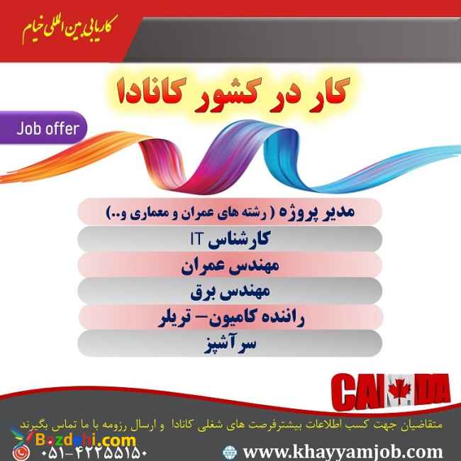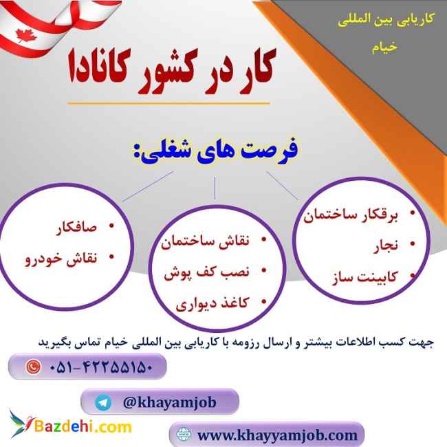 *کاریابی بین المللی خیام* *قابل توجه متقاضیان کار در کشور کانادا* فرصت های شغلی کار در کشور کانادا مطابق با مهارت و رشته های تحصیلی افراد شرایط کلی: * آشنایی به زبان انگلیسی * مدرک حداقل دیپلم و بالاتر * سن زیر 35 سال * سابقه کاری مرتبط با مهارت جهت کسب اطلاعات بیشتر با ما تماس بگیرید: 05142255150