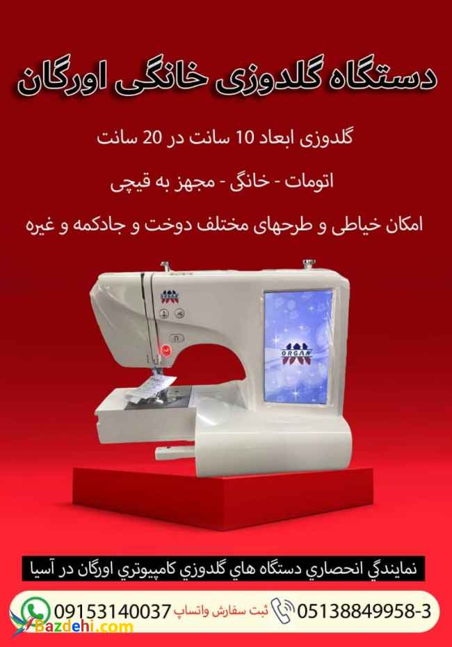 گلدوزی ابعاد 10 سانت در 20 سانت - اتومات - خانگی - مجهز به قیچی - امکان خیاطی و طرحهای مختلف دوخت ، جادکمه و غیره ............................................................................ به کانال تلگرام مابپیوندید : http://t.me/goldoziorgan  به کانال اینستا مابپیوندید: https://instagram.com/_u/goldozi.com.embroidery  سایت گلدوزان ایران: www. goldozi.com تلفن تماس جهت هماهنگی: 09153140037   05138849952 05138849953 با مدیریت: مجید ذوالفقاری