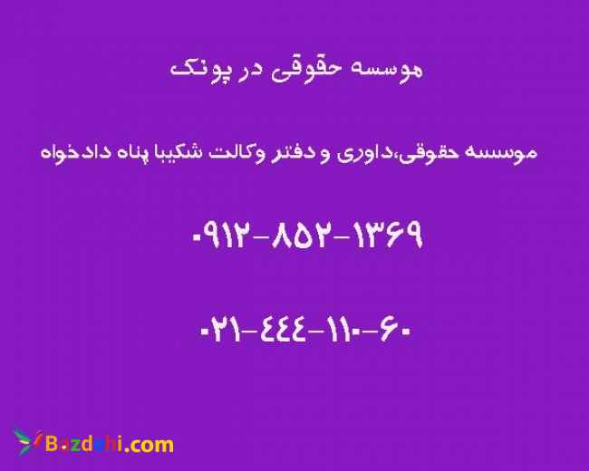 موسسه حقوقی در پونک موسسه حقوقی،داوری و دفتر (مشاوره رایگان) وکالت شکیبا پناه دادخواه 09128521369 44411060 با مدیریت خانم شکیبا جواهری کارشناس ارشد حقوق جزا و جرم شناسی نگران هزینه ها نباشید (اقساطی) باهمکاری وکلای پایه یک دادگستری قضات باز نشسته