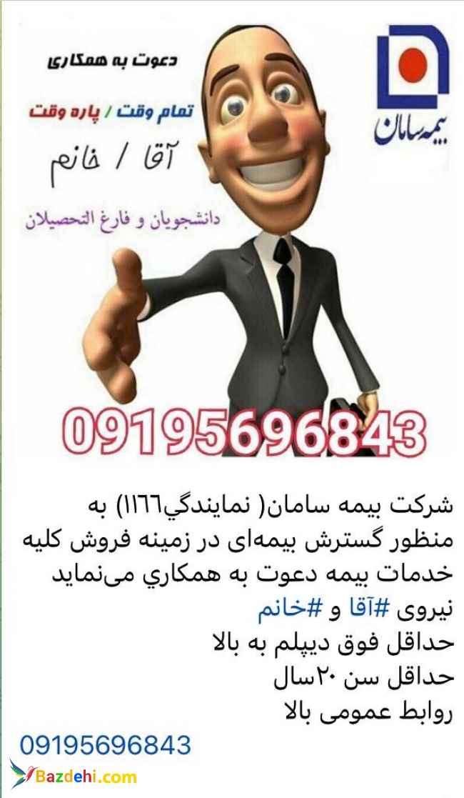 دعوت به همکاری بیمه سامان شرکت بیمه سامان نمایندگی 166 جهت گسترش بیمه ای در زمینه فروش کلیه خدمات بیمه دعوت به همکاری می نماید نیرو آقا و خانم حداقل فوق دیپلم حداقل سن 20 روابط عمومی بالا سراسر کشور دعوت به همکاری می شود. اشتغال در پردرآمدترین صنعت با درآمدی نامحدود بیمه سامان انتخاب کارمندهای بیمه مرکزی صدور انواع بیمه نامه ثالث بدنه عمر تکمیل درمانانفرادی و گروهی مسئولیت آتشسوزی و... بیمه آتش سوزی, بیمه اتومبیل , بیمه مهندسی, بیمه عمر, بیمه عمر و اندوخته ساز
