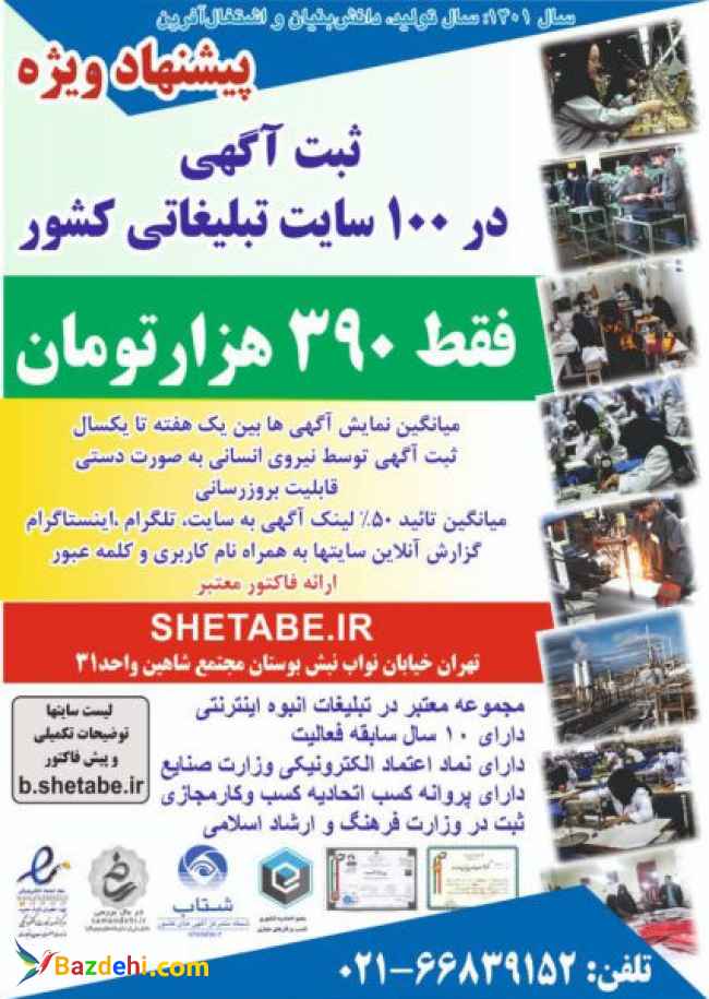 تبلیغات در سایت های اینترنتی یکی از بهترین روش ها برای دیده شدن کسب و کارهای مختلف است که به برند شدن آنها کمک می کند. این تبلیغات به شیوه های مختلفی به صورت تبلیغات آگهی ، تبلیغات گوگل ، تبلیغات پیامکی می باشد . تبلیغات در سایت های تبلیغاتی آگهی یک راه موثر برای معرفی برند و محصولات شما است. اگر به دنبال اثربخشی بیشتر آگهی تبلیغاتی رایگان خود هستید، نیاز است که به چند نکته مهم مانند عنوان آگهی جذاب ، استفاده کردن از کلمات کلیدی مرتبط با کسب و کار خود در متن آگهی و نوشتن آگهی به گونه ای کاربرپسند توجه داشته باشید. بدین صورت کاربر را تحت تاثیر مطالب خود قرار می دهید. البته نکته مهم تر انتخاب سایت های تبلیغاتی متناسب با کسب و کار شما بوده، که تاثیر بیشتری در تبلیغات دارد. مجموعه شتاب در زمینه تبلیغات در سایت های تبلیغاتی آگهی به صورت کاملا حرفه ای با سابقه بیش از ۱۰ سال دارای مجوز از وزارت فرهنگ و ارشاد اسلامي و دارای نماد اعتماد الکترونیکی و همچنین دارای جواز کسب و کار های مجازی موجود در سایت و با ارائه مشاوره به شما کمک می کند. آدرس: http://www.shetabe.ir جهت کسب اطلاعات بیشتر در مورد آگهی ها و رفع مشکلات و ابهامات خود ، با ما در تماس باشید راه های ارتباطی جهت سفارش آگهی تماس با ما: (9صبح تا 18) واحد جمهوری(شرق تهران): 66839152-021 واحد نواب(جنوب تهران) : 66385877-021 واحد انقلاب(مرکز تهران): 66489320-021 واحد ولیعصر(شمال تهران): 66175991-021 واحد ستارخان(غرب تهران): 66503457-021 حوزه مدیریت: 66133562-021 ارتباط در پیام رسان های زیر امکان پذیر است 09193841239 واتساپ، تلگرام، ایتا، سروش،بله،آیگپ،روبیکا آدرس دفتر پشتیبانی: تهران بزرگراه سعیدی خیابان مقدم نبش شیدائی پلاک۲۳۵ واحد۵ پرتال شبکه شتاب : shetabe.ir – shetabe.com تبلیغات در اینترنت تبلیغات گسترده در اینتزنت تبلیغ در صفحه اول گوگل آگهی در صفحه اول گوگل ثبت آگهی رایگان آگهی رایگان درج آگهی در گوگل درج آگهی در صفحه اول گوگل ثبت لحظه ای آگهی تبلیغات رایگان در شتاب تبلیغ خدمات تبلیغ نیازمندی ها درج آگهی مشاغل درج آگهی در زمینه های مختلف آموزش تبلیغ در گوگل آموزش تبلیغات رایگان در گوگل آگهی گوگل تبلیغ کار در گوگل تبلیغ در گوگل رایگان تبلیغ در اینترنت به صورت رایگان تبلیغات در صفحه اول گوگل تبلیغات در گوگل ارزان تبلیغات رایگان در گوگل تبلیغات در گوگل فارسی ثبت آگهی تبلیغاتی ثبت نام کسب و کار در گوگل روش ثبت آگهی در گوگل دسته کسب و کار در گوگل تبلیغ دسته کسب و کار در گوگل درج آگهی کاملا رایگان تبلیغات موثر در اینترنت تبلیغات گسترده در اینترنت ارسال پیامک تبلیغاتی درج آگهی در صدها سایت نیازمندی کشور ثبت آگهی ویژه