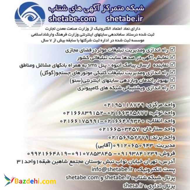 شبکه شتاب مشاور شما در امور تبلیغاتی اعم از : انمایش بیلبورد های تبلیغاتیتوضیح بروشور های چاپیطراحی تیزر و ساخت تبلیغات تلویزیونی و رادیوییطراحی سایت به سایت مبتدی وحرفه ایارسال اس ام اس انبوه به همراه بانک مشاغل و مناطقو کلیه امور تبلیغاتی در فضای مجازیارائه خدمات منحصر به فرد این شبکه به کاربران از جمله بسته های تبلیغاتی متنوع شامل انواع پنل های رایگان ارسال انبوه پیامک ، پست الکترونیک، فکس و گسترش دامنه تبلیغات واحدهای صنفی در فضای مجازی شامل تبلیغات هدفمند در شبکه های اجتماعی داخل و خارج از کشور و همچنین سامانه های تبلیغاتی فعال دیگر بهمراه خدمات رسانی در حوزه رسانه های دیداری و شنیداری و خدماتی بی نظیر در زمینه چاپ ، بیلبورد و نمایشگاه ها باعث شد تا این شبکه تبلیغاتی خود را از دیگر مجموعه های فعال تبلیغاتی در ایران متمایز نماید.نکته حائز اهمیت و شاخص اين شبكه دوري از روشهاي تبليغي مردم آزار از قبيل پيام هاي اجباري و مزاحم به هر شكل از پيامك تا ايميل گرفته تا افزايش كليك اجباري ، تبادل بنر متحرك و آزار دهنده و هدر دادن وقت و هزينه مردم در بالا رفتن رتبه در چند موتور جستجو كشورهاي بيگانه كه از اساس كاري عبث ، بيهوده و ناپايدار بوده و منجر به هدر رفتن سرمايه هاي ملي مي گردد .شبكه متمركز آگهي هاي کشور "شتاب" مفتخر به دریافت نماد اعتماد الکترونیکی از مرکز توسعه تجارت الکترونیکی وزارت صنعت ، معدن و تجارت و ثبت در ستاد ساماندهی سایتهای اینترنتی وزارت محترم فرهنگ و ارشاد اسلامی گردیده است .تلفن تماس واحد مرکزی : 02195118729واحد انقلاب: 02166489320-02166175991واحد نواب: 02166385877-02166839152واحد ستارخان: 02166503457واحد پرند: 02156952279واحد فروش: 09193841239-09921664819واحد پشتیبانی: 09107853845-09196881673مدیریت: 09120650943(آقایی) 6104337790405391آدرس: تهران خیابان نواب نبش بوستان مجتمع شاهین واحد 31پست الکترونیک: این آدرس ایمیل توسط spambots حفاظت می شود. برای دیدن شما نیاز به جاوا اسکریپت دارید پرتال شبکه شتاب : shetabe.ir و shetabe.comپرتال اداری: shesa.irکانال: shetabeirشبکه شتابروشهاي تبليغي تبلیغات را از چه شبکه ایی دنبال کنیم کدام شبکه تبلیغاتی معتبر استطراحی بنر های تبلیغاتی تبلیغ‌دهنده دیجیتال شبکه تبلیغاتی هوشمند و قدرتمند طراحی تبلیغاتیتبلغات ارزان ارزانترین راه تبلیغ اینترنتی دیدن شدن کار از راه تبلیغ اینترنتی شبکه معتبر برای تبلیغ اینترنتی بیشترین بازخورد از نمایش تبلیغاتتبلیغات اینترنتی آمادهدرج آگهی رایگان و آگهی ویژهتبلیغ کسب‌وکارتبلیغات برای رسیدن به هدفروش های مدرن تبلیغاتبرای چه چیزهایی تبلیغ می‌کنیم؟روش جدید برای تبلیغات در دنیای مجازیمشاور و مجری تبلیغاتدرج تبلیغ اینترنتی رایگان خدمات تبلیغات رایگان