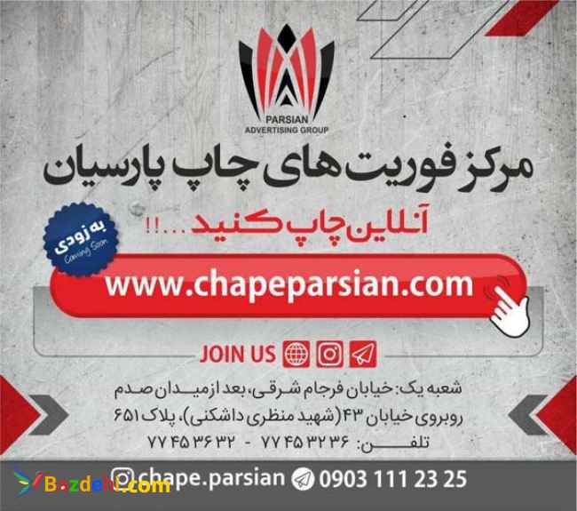 موسسه چاپ و تبلیغات پارسیان تولید کننده تابلو های حروف برجسته (چلنیوم، پلاستیک،رینگی،استیل و ...) تابلو روان ، مجهز به دستگاه لیزر و برش شبرنگ وحکاکی، دستگاه چاپ بنر ، فلکس، استیکر، مش ، پلات لمینیت و ... طراحی و چاپ انواع سفارشات چاپی و غیر چاپی ، طراحی لوگو ، کارت ویزیت ، تراکت، استند، ست اداری ، کاتالوگ ، بروشور و ... چاپ آنلاین از طریق سایت بیش از ۱۸ سال سابقه درخشان در تهران رضا پارسیان تلفن ثابت : ۰۲۱۷۷۴۵۳۶۳۲-۰۲۱۷۷۴۵۳۲۳۶ آدرس سایت : www.chapeparsian.com لینک اینستاگرام :chape.parsian شماره موبایل : ۰۹۱۲۴۸۰۷۲۹۰ Email : این آدرس ایمیل توسط spambots حفاظت می شود. برای دیدن شما نیاز به جاوا اسکریپت دارید نشانی : رسالت، فرجام شرقی ، روبروی خیابان ۴۳ (منظری داشکنی) تابلو تابلوسازی چاپ تبلیغات تراکت بنر کارت ویزیت لیبل فلکس شبرنگ مش. استیکر چلنیوم فلکس حکاکی نئون ست اداری طراحی گرافیک تبلیغات LED کاتالوگ برچسب انواع تابلو روان انواع حروف برجسته تابلو انواع کارت ویزیت آموزش طراحی ست اداری آنلاین چاپ بهترین مارک دستگاه چاپ بنر پرینت آنلاین پلاستیک چیست پلاستیک فشرده تابلو چلنیوم طلایی تابلو دکوراتیو مدرن تابلو دیجی کالا تابلو روان آماده تابلو روان نرم افزار تابلو فلکس تابلو کلاسیک تابلو مدرن تابلو مغازه تابلو نقاشی تابلوسازی تهران تابلوسازی حروف برجسته تابلوسازی طاهر تابلوسازی مشهد تابلوسازی مطب تابلوهای فلکسی جدید تجزیه پلاستیک تعمیرات تابلو روان چاپ افست فوری چاپ آراد چاپ آقا چاپ آنلاین چاپ با کیفیت چاپ بروشور آنلاین چاپ شاپ چاپ شاپرک چاپ کارت ویزیت خاص چاپ کارت ویزیت مربعی چاپ کهن چاپ نقش الماس چلنیوم rgb چلنیوم پانچی چلنیوم قیمت حروف برجسته استیل حروف برجسته انگلیسی حروف برجسته پلاستیکی حروف برجسته چلنیوم خرید تابلو برای پذیرایی خرید تابلو شاسی دستگاه چاپ بنر اقساطی دستگاه چاپ بنر دیوار رزومه تابلوسازی رشته طراحی لوگو ساخت حروف برجسته فلزی سازنده تابلوهای فلکسی سپری تابلو فلکس ست اداری به انگلیسی چیست ست اداری چیست ست اداری خلاقانه ست اداری دانلود ست اداری شیک سفارش طراحی لوگو آنلاین شرکت تابلوسازی صنعت پلاستیک طراحی آنلاین کارت ویزیت طراحی تابلو فلکس طراحی فلکس طراحی لوگو اسم طراحی لوگو حرفه ای طراحی لوگو رایگان طراحی لوگو غرب تهران طرح کارت ویزیت فرمول شیمیایی پلاستیک فلکس ماشین فواید پلاستیک قرارداد تابلوسازی قیمت پلاستیک قیمت تابلو حروف برجسته چلنیوم قیمت تابلو روان دست دوم قیمت چلنیوم طلایی قیمت حروف برجسته فلزی قیمت دستگاه چاپ بنر دست دوم قیمت دستگاه چاپ بنر دی جی کالا قیمت دستگاه چاپ بنر رکورد قیمت دستگاه چاپ بنر عرض 180 قیمت ست اداری قیمت طراحی کارت ویزیت قیمت طراحی لوگو قیمت قاب تابلو روان کارگاه تابلو سازی لیست قیمت قطعات تابلو روان نرم افزار طراحی لوگو نصب تابلو فلکسی نمونه کارت ویزیت ورق چلنیوم
