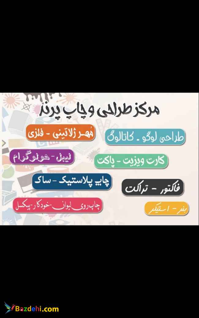 طراحی لوگو و کاتالوگ کارت ویزیت, فاکتور, تراکت ,پاکت انواع برچسب و هولوگرام بنر , فلکسی , مهر ژلاتینی و فلزی چاپ روی ساک دستی , پلاستیک , خودکار چاپ قاب گوشی , پازل, پیکسل, لیوان, قالیچه مهر ژلاتینی و فلزی مهر برجسته و پرسی مهر داغی روی چرم و چوب و ... آدرس : شیراز , چهارراه زند, ابتدای خیابان سعدی , سمت چپ , جنب بانک ملت تلفن : 8097 789 0917 8097 789 0935 پست الکترونیک : این آدرس ایمیل توسط spambots حفاظت می شود. برای دیدن شما نیاز به جاوا اسکریپت دارید