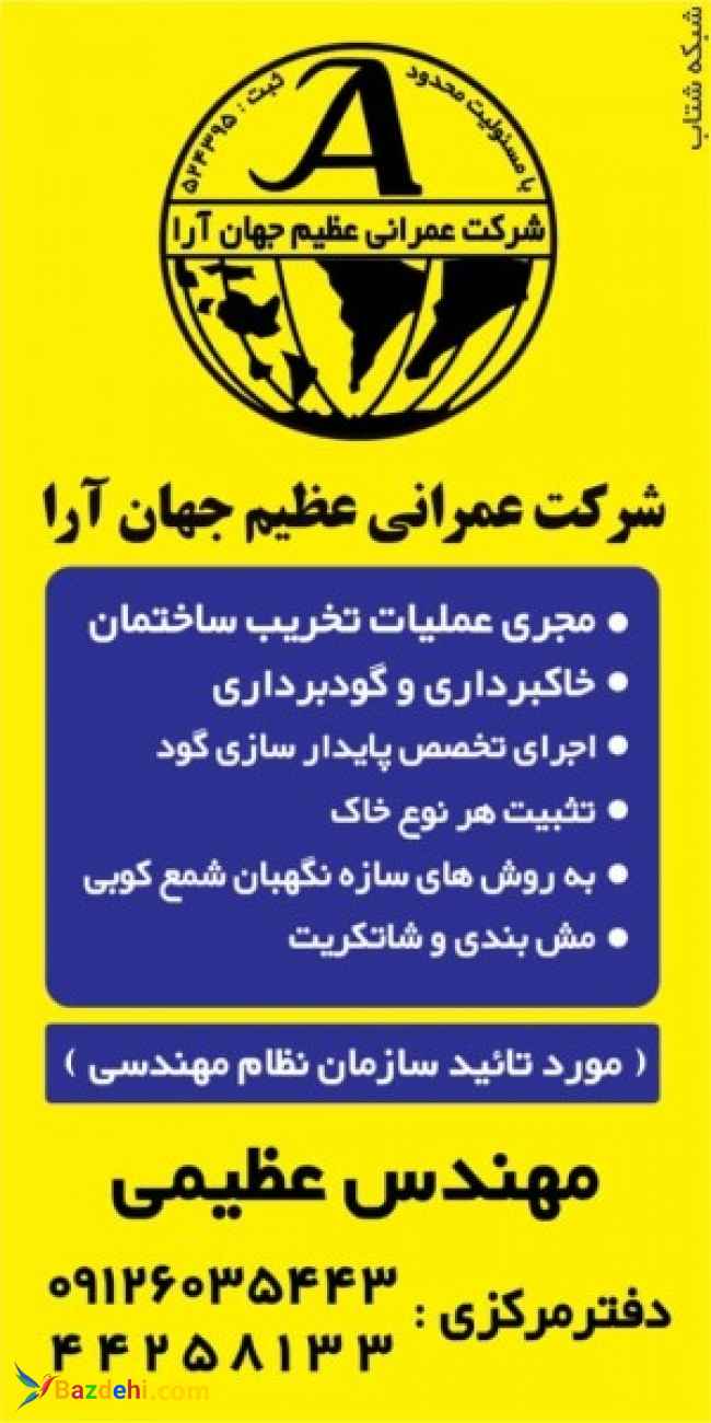 مهندس جواد عظیمی مدیر شرکت عمرانی عظیم جهان آرا --- طراح و مجری عملیات تخریب ساختمان -خاکبرداری و گودبرداری- پایدارسازی گود به روش های سازه نگهبان و نیلینگ و شاتکریت و شمع کوبی . ۰۹۱۲۶۰۳۵۴۴۳ و دفتر صادقیه ۴۴۲۵۸۱۳۳ ((بنام یگانه معمار هستی )) خشت اول گر نهد معمار کج /// تا ثریا می رود دیوار کج یک (((لحظه غفلت = یک عمر پشیمانی ))) .......پیمانکاری برای کارگاه خود انتخاب کنید که ایمنی و آرامش و صداقت کاری را رعایت کند....... شرکت عمرانی عظیم جهان آرا با مدیریت مهندس جواد عظیمی با بیش از ۲۲ سال سابقه اجرایی و بالغ بر ۷۰۰نمونه کار موفق و رضایت مندی کارفرمایان محترم دارای کد پیمانکاری از ستاد پسماند و عضو سازمان نظام مهندسی استان تهران و دارای گواهینامه متعدد در خصوص حفاظت فنی و ایمنی از مرکز مرکز تحقیقات و تعلیمات وزارت کار. کلیه عملیات تخریب ساختمان خاکبرداری و گودبرداری و پایدارسازی و تثبیت خاک گود های حساس و خطرناک به صورت فنی و مهندسی و دارای تائیدیه سازمان نظام مهندسی استان تهران و ناظران شهرداری و اجرای تخصصی سازه نگهبان به روش های نوین ساختمانی اعم از مهار متقابل و خرپا و نیلینگ و انکراژ و مش و شاتکریت و شمع کوبی و هر آنچه که در طراحی دیده شده باشد. کلیه مسئولیت ایمنی و فنی کارگاه و پرسنل پیمانکار و پایدارسازی گود و ملک های مجاور بر عهده شرکت عمرانی عظیم جهان آرا می باشد همراه 1 : ۹۱۲۶۰۳۵۴۴۳ همراه ۳: ۰۹۱۲۹۰۹۰۱۶۰ تلفن 2 : ۴۴۲۵۸۱۳۳ آدرس ایمیل : این آدرس ایمیل توسط spambots حفاظت می شود. برای دیدن شما نیاز به جاوا اسکریپت دارید آدرس سایت : http://Jahanara-contractor.ir آدرس:فلکه اول صادقیه خیابان پائیزان تخریب ساختمان (((یک لحظه غفلت = یک عمر پشیمانی))) اجرای سازه نگهبان آوار برداری پیمانکار تخریب ساختمان پیمانکار سازه نگهبان تخریب تخریب آسفالت تخریب بتن تخریب بتی تخریب ساختمان تخریب ساختمان بتنی تخریب ساختمان فلزی تخریب ساروج تخریب فلزی تخریب فونداسیون تخریب کار مهندسی خاکبرداری سازه نگهبان شرکت تخریب شرکت تخریب ساختمان شرکت تخریب و خاکبرداری شرکت خاکبرداری شرکت گودبرداری شرکت مهندسی تخریب ساختمان شرکت مهندسی خاکبرداری قیمت تخریب ساختمان گودبرداری مهندس تخریب مهندسی تخریب نحوه تخریب ساختمان تخریب ساختمان