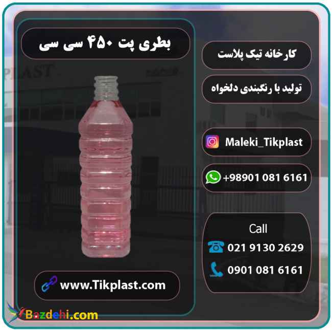 امروزه صنعت بسته بندی وابستگی بسیاری به پلاستیک دارد و ظروف بسیار متنوعی برای بسته بندی و نگه داری محصولات مختلف طراحی و تولید می شوند. کارخانه تیک پلاست طراح و تولید کننده انواع ظروف پلاستیکی پت و پلی اتیلن است و بیش از 200 نوع بطری مختلف را با ظاهر مختلف طراحی و تولید می کند.بطری پت 450 سی سی چهار گوش یکی از پت های پر طرفدار است و با توجه به ظرفیت متوسطی که دارد در مصارف متعددی مورد استفاده قرار می گیرد. قیمت ظروف پت با توجه به عوامل مختلفی تغییر پیدا می کند ، اما با توجه به اینکه کارخانه تیک پلاست به صورت مستقیم در این صنعت فعالیت می کند و از تهیه مواد اولیه تا تولید و فروش محصول را بدون حضور واسطه انجام می دهد به همین دلیل قیمت بسیار مناسب تری را برای فروش محصول در نظر می گیرد. تولید کنندگان pet در ایران که تمامی استاندارد های لازم را در تولید ظروف پت رعایت کند تعداد کمی دارند ، اما کارخانه تیک پلاست با رعایت تمامی شیوه نامه های بهداشتی و ایمنی ظروف پت را تولید می کند ، بنابراین می توانید با اطمینان خاطر از این ظروف استفاده کنید. قیمت انواع پت قیمت پت خالی قیمت عمده بطری پت بطری 400 سی سی پت قیمت بطری پلاستیکی 500 سی سی بطری 450 سی سی پت درجه یک خرید بطری پت آبمیوه خرید بطری 500 سی سی فروش عمده ظروف و بطری پت 450 سی سی برای خرید انواع ظروف پلاستیکی شوینده در تهران ، کرج ، اصفهان ، شیراز ، اهواز ، مشهد ، یزد ، کرمان ، کرمانشاه ، مازندران ، گیلان ، بندر عباس ، زاهدان ، ایلام ، تبریز ، ارومیه ، اردبیل و سایر شهر ها با شماره های زیر تماس بگیرید . پشتیبانی فروش : ۰۹۳۵۵۱۳۱۳۲۳ خط ثابت : ۰۲۱۹۱۳۰۲۶۲۹