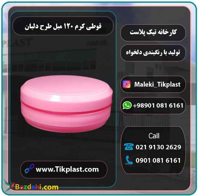 کارخانه تیک صنعت پلاست طراح یکی از تولید کنندگان و عرضه کنندگان بسیار پیشرفته و مطرح ظروف پلاستیکی در کشور است که با استفاده از چندین دستگاه مختلف پلاستیک تزریق ، بادی و بادکن انواع بسیار متنوعی از ظروف پلاستیکی را طراحی و تولید می کند. این کارخانه با بیش از صد نوع قالب مختلف ، تنوع بسیار زیادی را در محصولات خود ایجاد می کند و مشتریان می توانند به راحتی محصول خود را بین این ظروف پیدا کنند. این کارخانه ظروف پلاستیکی بسیار متنوعی را برای صنعت بسته بندی آرایشی بهداشتی طراحی و تولید می کند و تمامی این ظروف کاملا بهداشتی هستند و به لحاظ ظاهری از ظاهر زیبایی برخوردار می باشند. قوطی کرم دلبان 120 گرمی یکی از قوطی های کرم پرطرفدار است که به دلیل حجم و ظرفیت استاندارد و ظاهر شکیل بسیار مورد استفاده قرار می گیرد. این قوطی کرم دارای درب پیچی است که به راحتی باز و بسته می شود و عایق بندی بسیار خوبی دارد .قوطی کرم دلبان 120 گرمی با مواد 100% نو مرغوب تولید می شود ، به همین دلیل برای نگه داری کرم بهداشتی کاملا مناسب است و به هیچ عنوان کیفیت کرم را تحت تاثیر منفی قرار نمی دهد. فروش عمده قوطی کرم فروش قوطی کرم در اصفهان خرید قوطی کرم در شیراز قوطی کرم خارجی خرید قوطی کرم قوطی کرم دلبان قوطی کرم دلبان 120 گرمی قوطی کرم 120 گرمی دلبان برای خرید قوطی کرم 120 گرمی دلبان در شهر های مشهد ، اصفهان ، تهران ، کرج ، شیراز ، کرمانشاه ، اهواز ، زاهدان ، بوشهر ، خوزستان ، تبریز ، ارومیه ، گرگان و ... با شماره های موجود فقط تماس حاصل نمایید. آدرس کارخانه : کرج ، هفت جوی ، شهرک صنعتی زرین دشت مدیر فروش : 09021613823