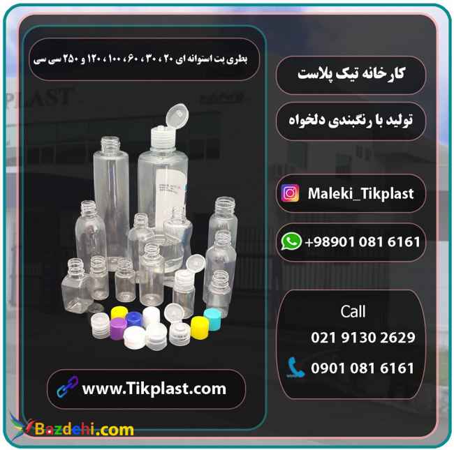 کارخانه تیک پلاست یکی از کارخانه های بزرگ تولید کننده انواع بطری و ظروف پلی اتیلن و پت است. این کارخانه بدون حضور هیچ گونه واسطه ای و به صورت کاملا مستقل فعالیت می کند و با تهیه مواد اولیه و طراحی و تولید قالب و فروش محصولات به صورت مستقیم ، قیمت بسیار مناسب تری را برای فروش محصولات خود درنظر می گیرد. این کارخانه با بیش از صد نوع قالب مختلف بطری های پت را در انواع متنوع کتابی و استوانه ای با ظرفیت های مختلف از کوچک تا بزرگ تولید می کند. بطری پت از ماده ای به اسم پت که مخفف کلمه پلی اتیلن ترفتالات است ساخته شده می باشد. پلی اتیلن ترفتالات بسیار بهداشتی و با کیفیت است و به هیچ عنوان منجر به افت کیفیت محصول نمی شود به همین دلیل از پت به عنوان پلاستیک پاک یاد می کنند و بهترین و با کیفیت ترین گزینه برای نگه داری محصولات غذایی به حساب می آید. کارخانه تیک پلاست ، تولید کننده انواع بطری و ظروف پت بهداشتی در تهران بطری پت بهداشتی کتابی و استوانه ای درجه 1 بطری پت 500 ، 40 ، 300 ، 250 ، 200 ، 120 و 100 سی سی استوانه ای بطری پت استوانه ای 2 ، 30 ، 40 ، 60 ، 80، 100 و 120 سی سی بطری پت کوچک بطری پت دارویی بطری پت استوانه ای + درب فیلیپ تاپ ، درب اسپری و فندکی و ... برای خرید بطری پت استوانه ای در شهر های تهران ، کرج ، اصفهان ، مشهد ، قزوین ، شیراز و سایر نقاط تماس بگیرید. 09355131323 09010816161 02191302629 کارخانه شماره 1 : کرج - هفت جوی کارخانه شماره 2 : تهران ورامین آدرس شرکت : کرج - هفت جوی - شهرک صنعتی زرین دشت
