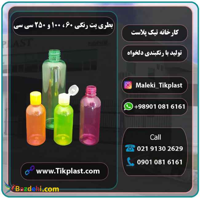 کارخانه تیک صنعت پلاست طراح یکی از تولید کنندگان پیشرفته و بزرگ بطری پت در ایران است و طی یک دهه اخیر موفق شده تا بیش از صد نوع محصول مختلف را طراحی و تولید کند. با توجه به اینکه این کارخانه در زمینه تولید ظروف پلاستیکی کاملا مستقل فعالیت می کند و بدون حضور هیچ واسطه ای از تهیه مواد اولیه تا ساخت قالب و تولید و فروش محصول را انجام می دهد ، به همین دلیل ظروف پلاستیکی را با قیمت بسیار مناسب تری به نسبت واسطه ها به فروش می رساند. برای تولید انواع بطری پت از دستگاهی به نام دستگاه پلاستیک بادکن استفاده می کنند ، البته قبل از تولید بطری پت ، پریفرم آن تولید می شود که فرآیند تولید پریفرم با استفاده از دستگاه تزریق صورت می گیرد. بطری پت رنگی یکی از انواع پر مصرف و کاربردی انواع ظروف پت است که به دلیل ظاهر جذاب و خیره کننده بسیار پر طرفدار است. بطری ها پت رنگی در ظرفیت های مختلفی تولید می شوند و مصرف کننده می تواند ظرف دلخواه را با توجه به نیاز نوع مصرف انتخاب کند. فروش بطری پت رنگی تولید بطری پت تولید کننده بطری پت قیمت عمده بطری پت بطری پت 10 ، 20 ، 30 ، 40 ، 60 ، 100 ، و 120 سی سی بطری پت 200 ، 250 ، 300 و 500 سی سی بطری pet فروش اینترنتی بطری پت قیمت عمده بطری پت برای خرید انواع بطری پت کوچک دارویی رنگی در شهر های مشهد ، اصفهان ، تهران ، کرج ، شیراز ، کرمانشاه ، اهواز ، زاهدان ، بوشهر ، خوزستان ، تبریز ، ارومیه ، گرگان و ... با شماره های موجود فقط تماس حاصل نمایید. آدرس کارخانه : کرج ، هفت جوی ، شهرک صنعتی زرین دشت مدیر فروش : 09021613823