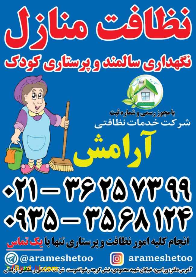 ✔✔مرکز خدمات آرامش✔✔ ⭐⭐ارائه خدمات سراسر استان تهران ⭐⭐ ✴با مجوز،رسمی✴ ◾باسابقه ای درخشان در زمینه مجری تامین نیروی انسانی (روزانه و شبانه روزی) ▶مراقبت از سالمند(سالم/ايزيلايفي/لگنی/آلزايمري) ▶مراقبت از نوزاد و کودک توسط نیروهای آموزش دیده و قابل اعتماد ▶همراه بیمار جهت بیمارستان و منزل ▶امور منزل و آشپزي ▶نظافت منازل/ادارات/راه پله ▶نگهبانی و سرايداري ⭐⭐بصورت روزمزدي/پاره وقت/روزانه/شبانه روزی ⭐⭐ ✅نیروهای جوان/ باتجربه/ تحصیل کرده و قابل اعتماد را از ما بخواهید✅ ✅با یک تماس در کوتاهترین زمان از خدمات ما بهره مند شويد✅ اساسی ترین شعار ما آرامش"خیال شماست.* آدرس مرکز:ورامین میدان امام حسین جنب دادگستری خیابان عدل پلاک 8طبقه دوم شماره های تماس : 09129278172 02136257399 با مدیریت اقلیمی