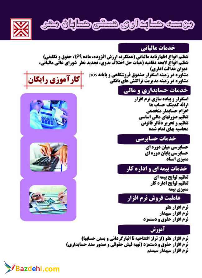 انجام خدمات مالیاتی شامل : تنظیم انواع اظهارنامه مالیاتی ( عملکرد ، ارزش افزوده ، ماده 169 ، حقوق و تکلیفی ) تنظیم انواع لایحه دفاعیه ( هیات حل اختلاف بدوی ، تجدید نظر ، شورای عالی مالیاتی ، دیوان عدالت اداری ) مشاوره در زمینه استقرار صندوق فروشگاهی و پایانه pos مشاوره در زمینه مدیریت تراکنشهای بانکی 2- انجام خدمات حسابداری و مالی استقرار و پیاده سازی نرم افزار ارائه کدینگ حساب ها اعزام حسابدار متخصص تنظیم صورتهای مالی اساسی تنظیم و تحریر دفاتر قانونی محاسبه بهای تمام شده 3- انجام خدمات حسابرسی حسابرسی میان دوره ای حسابرسی پایان دوره ای ممیزی اسناد 4- انجام خدمات بیمه ای و اداره کار تنظیم لوایح بيمه اي تنظيم لوايح اداره کار مميزی بيمه 5-عاملیت فروش نرم افزارهای حسابداری نرم افزار هلو نرم افزار سپیدار نرم افزار حقوق و دستمزد همه موارد در شرکت حسابداری هستی حسابان مهر برای اطلاعات بیشتر با شماره تلفن:02632735426-09375732447