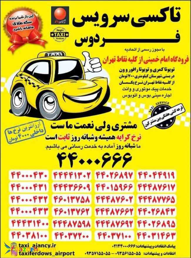 تاکسی سرویس فردوس با مجوز رسمی و ربع قرن سابقه در مدیریت و اجرای سفرهای سیاحتی و زیارتی و درون شهری و برون شهری دارای چندین شعبه درتهران و سرتاسر ایران می باشد بهترین کادرمجرب با لباسهای فرم - تاکسی دراختیار-آماده عقد قرارداد جهت سرویس ارگانها ونهادها رزرو شبانه روزی -تاکسی فرودگاه امام خمینی ارزان شامل تویوتا کمری ،تویوتا رافور،ون،هایس،مینی بوس،اجاره اتوبوس -سرویس های درون شهری وبرون شهری و کیلومتری تاکسی دربستی،تاکسی دربست،تاکسی شهرستان دربستی،تاکسی دربست شهرستان،تاکسی دربستی بین شهری،تاکسی دربستی درون شهری،تاکسی دربست درون شهری، دربست، تاکسی فرودگاه امام خمینی - تاکسی فرودکاه امام خمینی -تویوتا کمری فرودگاه امام- تویوتا رافورفرودگاه امام -ون فرودگاه امام خمینی- رزرو ون فرودگاه امام خمینی -تاکسی شهرستان- رزروتاکسی شهرستان- تاکسی کیلومتری شهرستان -اجاره اتوبوس -تاکسی فرودگاه امام خمینی نزدیک-تاکسی دراختیار-تاکسی دربست—تاکسی دراختیار تهران-تاکسی دربست—تاکسی vip دراختیار-تاکسی دراختیار شهرستان-تاکسی دربست دراختیار-تاکسی دربستی شهرستان--تاکسی دربست شهرستان-تاکسی دراختیار-رزرو تاکسی دربست--رزرو تاکسی دربست شهرستان تویوتا کمری فرودگاه امام خمینی،تویوتا رافورفرودگاه امام،ون، –تاکسی فرودگاه امام واقع درتهران تاکسی رویال تویوتارافور رویال تویوتارافور سیروسفر تویوتاکمری رویال سفرتویوتاکمری شهرستان تاکسی وی آی پی دربستی تاکسی وی آی پی شهرستان سواری وی آی پی شهرستان سواری وی آی پی دربستی تاکسی وی آی پی بین شهری تاکسی رویال تاکسی رویال سفرتاکسی رویال تویوتارافور رویال سفرتویوتارافور سیروسفر تویوتاکمری رویال سفرتویوتاکمری تاکسی لوکس شهرستان شهرستان تاکسی وی آی پی دربستی تاکسی وی آی پی شهرستان تاکسی لوکس شهرستان تاکسی لوکسی بین شهری تاکسی لوکس برون شهری سواری لوکس شهرستان سواری لوکس بین شهری شهری تاکسی لوکس فرودگاه رزروتاکسی لوکس رزروتاکسی رویال سفررزروتاکسی رویال سفر رزروآنلاین تاکسی رویال سفررزروتاکسی پاکرو رزروتاکسی رویال سفر شهرستان رزروتاکسی رویال سفر فرودگاه امام خمینی رزروتاکسی پاکروشهرستان لوکس تاکسی پاکرو فرودگاه امام رزروتاکسی پاکرو شهرستان تاکسی پاکرودراختیار تاکسی پاکرو برون شهری تاکسی پاکرو بین شهری رزروتاکسی پاکروشهرستان دراختیار رزروتاکسی پاکرو رزروتاکسی سیروسفر رزروتاکسی سیروسفرشهرستان رزروتاکسی سیروسفرفرودگاه امام خمینی رزروتاکسی سیروسفربرون شهری رزروتاکسی سیروسفربین شهری رزروتاکسی دربستی سیروسفررزروتاکسی همسفرشهرستان رزروتاکسی همسفردربستی رزروتاکسی همسفربرون شهری رزروتاکسی همسفر بین شهری رزروتاکسی همسفر فرودگاه امام رزروتاکسی همسفردراختیار تاکسی vipرزروسواری وی آی پی شهرستان رزروسواری وی آی پی بین شهری رزروسواری وی آی پی دربستی رزروسواری وی آی پی برون شهری رزروسواری وی آی پی دراختیار تاکسی وی آی پی شهری رزروون فرودگاه امام رزرو ون فرودگاه امام رزروتاکسی فرودگاه امام رزروتاکسی ارزان فرودگاه امام رزرو تاکسی vip فرودگاه امام رزرو ون شهرستان رزرو ون دربستی بین شهری رزرو سوتا شهرستان رزرو کمری شهرستان رزروسوناتا دراختیار سوناتا شهرستان سوناتا دربستی سوناتا بین شهری سوناتا بین شهری رزروتویوتارافور شهرستان تویوتارافورشهرستان رزروتویوتاکمری بین شهری رزرو تویوتاکمری بروشهری رزروتویوتاکمری دربستی رزرو سوناتابرون شهری رزروتویوتارافور بین شهری رزروتویوتا رافور دربستی رزروتویوتارافورشهری رزروتویوتارافور شهرستان تویوتارافور دربستی تویوتارافور دربست تویوتاروفور شهرستان رزرو تویوتاra4 تویوتاra4شهرستان رزروتویوتاra4 دربستی تویوتاra4دراختیاررافورشهری رزروتویوتاکمری شهرستان رزرو تویوتاکمری دربستی رزروتویوتاکمری دربست رزروتویوتاکمری بین شهری رزروتویوتاکمری دربستی رزروسواری وی آی پی شهرستان رزروتاکسی vipشهرس
