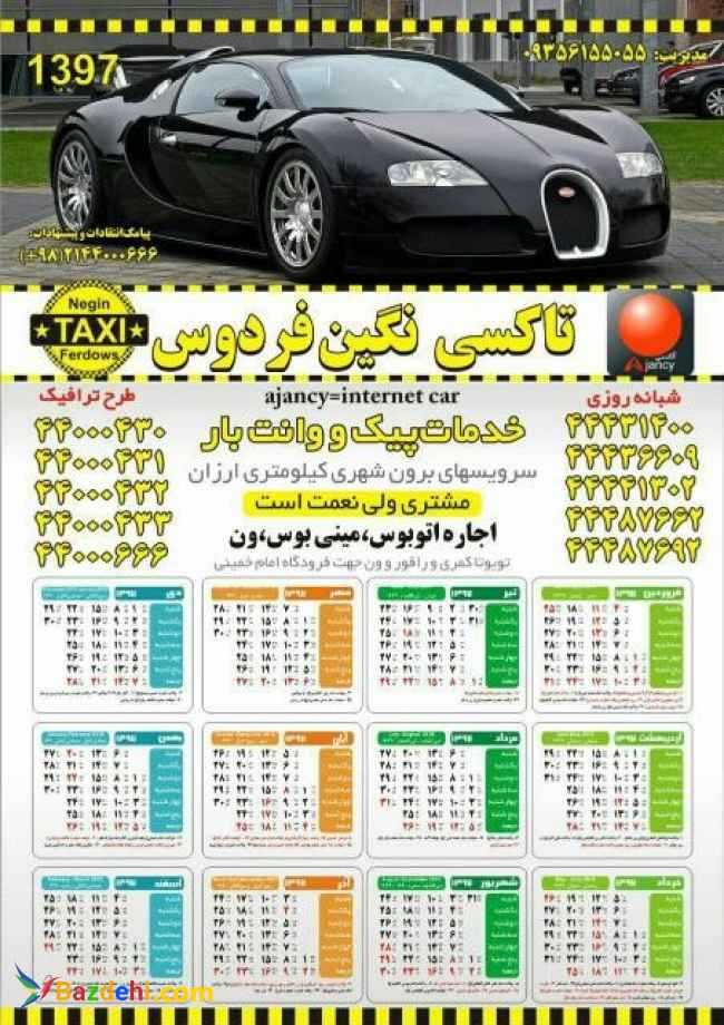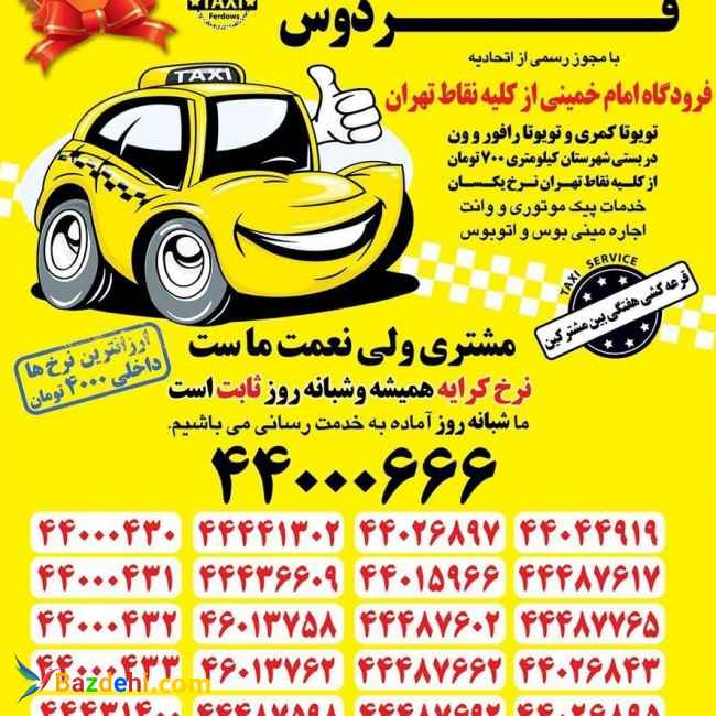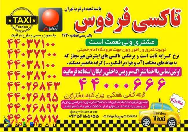 تاکسی سرویس فردوس با مجوز رسمی و ربع قرن سابقه در مدیریت و اجرای تاکسی سرویس وپیک موتوری شبانه روزی خدمات کاملی را برای مشتریان ارایه می دهد. دارای چندین شعبه در تهران می باشد. (قرعه کشی هفتگی بین کلیه مشترکین) خدمات قابل ارایه: - بیشترین آرم طرح ترافیک - بهترین کادر مجرب - تاکسی دراختیار-آماده عقد قرارداد جهت سرویس مدارس ارگانها و نهادها - خدمات شبانه روزی -تاکسی فرودگاه امام خمینی ارزان شامل تویوتا کمری ،تویوتا رافور،ون،هایس،مینی بوس،اجاره اتوبوس - خدمات سریع السیر پیک -سرویس های درون شهری وبرون شهری و کیلومتری-حمل بار شهرستان-حمل باردرون شهری-حمل بسته شهرستان-حمل بسته برون شهری-انجام کلیه امورپستی-انجام اموربارنامه-انجام اموبارنامه هوائی وزمینی تاکسی دربستی،تاکسی دربست،تاکسی شهرستان دربستی،تاکسی دربست شهرستان،تاکسی دربستی بین شهری،تاکسی دربستی درون شهری،تاکسی دربست درون شهری، دربست، تاکسی فرودگاه امام خمینی - تاکسی فرودکاه امام خمینی -تویوتا کمری فرودگاه امام- تویوتا رافورفرودگاه امام -ون فرودگاه امام خمینی- رزرو ون فرودگاه امام خمینی -تاکسی شهرستان- رزروتاکسی شهرستان- تاکسی کیلومتری شهرستان -اجاره اتوبوس -تاکسی فرودگاه امام خمینی نزدیک-تاکسی دراختیار-تاکسی دربست—تاکسی دراختیار تهران-تاکسی دربست—تاکسی vip دراختیار-تاکسی دراختیار شهرستان-تاکسی دربست دراختیار-تاکسی دربستی شهرستان--تاکسی دربست شهرستان-تاکسی دراختیار-رزرو تاکسی دربست--رزرو تاکسی دربست شهرستان تویوتا کمری فرودگاه امام خمینی،تویوتا رافورفرودگاه امام،ون، حمل بار برون شهری تاکسی شهرستان بارنامه هوائی و زمینی حمل بار شهرستان حمل مرسوله به شهرستان حمل بسته درون شهری و برون شهری حمل بار به شهرستان حمل بسته ازتهران –سایت وانت بارفردوس-سایت تاکسی فردوس-سایت تاکسی تلفنی فردوس-سایت پیک موتوری فردوس-سایت تاکسی فرودگاه امام خمینی-سایت ون فرودگاه امام خمینی-سایت رزرو تاکسی بین شهری-سایت تاکسی دربستی شهرستان –سایت ون شهرستان شماره تماس 46013758-46013762-44431400-44487602-44487662-44487692-44487617-44487598-44487765-44436609-44441302-44026843-44026895-44026897-44044919-44015966-44000430-44000431-44000432-44000433-44000666 مسیر مبدا تاکسی شهرستان در قم تاکسی شهرستان در متل قو تاکسی شهرستان در همدان تاکسی شهرستان در کرمانشاه تاکسی شهرستان در کاشان تاکسی شهرستان در کرمان تاکسی شهرستان در محمودآباد تاکسی شهرستان در آمل تاکسی شهرستان در چمستان تاکسی شهرستان در قائم شهر تاکسی شهرستان در تنکابن تاکسی شهرستان در آبادان تاکسی شهرستان در اراک تاکسی شهرستان در بندرعباس تاکسی شهرستان در بندرانزلی تاکسی شهرستان در قزوین تاکسی شهرستان در میانه تاکسی شهرستان در یاسوج تاکسی شهرستان در بروجرد تاکسی شهرستان در اشتهارد تاکسی شهرستان در ابیانه تاکسی شهرستان در اردبیل تاکسی شهرستان در ارومیه تاکسی شهرستان در دماوند تاکسی شهرستان در کردان تاکسی شهرستان در بومهن تاکسی شهرستان در پردیس تاکسی شهرستان در رودهن تاکسی شهرستان در قزوین تاکسی شهرستان در مرند تاکسی شهرستان در شهرک صنعتی اشتهارد تاکسی شهرستان در شهرک صنعتی کاسپین تاکسی شهرستان در شهرک صنعتی چرمشهر تاکسی شهرستان در شهرک صنعتی شمس آباد تاکسی شهرستان در شهرک صنعتی ایوانکی تاکسی شهرستان در شهرک صنعتی گلگون تاکسی شهرستان در شهرک صنعتی مامونیه تاکسی شهرستان در شهرک صنعتی عباس آباد تاکسی شهرستان در شهرک صنعتی ساوه تاکسی شهرستان در شهرک صنعتی سلفچگان تاکسی شهرستان در تبریز تاکسی شهرستان در رشت تاکسی شهرستان در اصفهان تاکسی شهرستان در آستارا تاکسی شهرستان در سبزوار تاکسی شهرستان در ایوانکی تاکسی شهرستان در عباس آباد تاکسی شهرستان در طالقان تاکسی شهرستان در هشتگرد تاکسی شهرستان در لواسان تاکسی شهرستان در کاشان تاکسی شهرستان در خمین تاکسی شهرستان در زاهدان تاکسی شهرستان در زنجان تاکسی شهرستان در ساری تاکسی شهرستان در سمنان تاکسی شهرستا