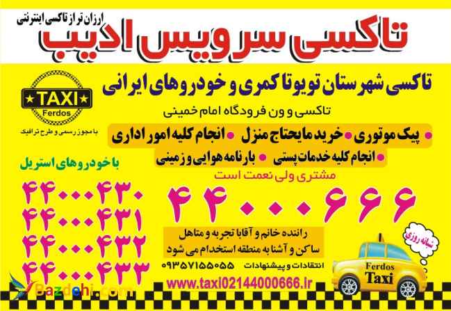 تاکسی سرویس فردوس با مجوز رسمی و ربع قرن سابقه در مدیریت و اجرای تاکسی سرویس وپیک موتوری شبانه روزی خدمات کاملی را برای مشتریان ارایه می دهد. دارای چندین شعبه در تهران می باشد. (قرعه کشی هفتگی بین کلیه مشترکین) خدمات قابل ارایه: - بیشترین آرم طرح ترافیک - بهترین کادر مجرب - تاکسی دراختیار-آماده عقد قرارداد جهت سرویس مدارس ارگانها و نهادها - خدمات شبانه روزی -تاکسی فرودگاه امام خمینی ارزان شامل تویوتا کمری ،تویوتا رافور،ون،هایس،مینی بوس،اجاره اتوبوس - خدمات سریع السیر پیک -سرویس های درون شهری وبرون شهری و کیلومتری-حمل بار شهرستان-حمل باردرون شهری-حمل بسته شهرستان-حمل بسته برون شهری-انجام کلیه امورپستی-انجام اموربارنامه-انجام اموبارنامه هوائی وزمینی تاکسی دربستی،تاکسی دربست،تاکسی شهرستان دربستی،تاکسی دربست شهرستان،تاکسی دربستی بین شهری،تاکسی دربستی درون شهری،تاکسی دربست درون شهری، دربست، تاکسی فرودگاه امام خمینی - تاکسی فرودکاه امام خمینی -تویوتا کمری فرودگاه امام- تویوتا رافورفرودگاه امام -ون فرودگاه امام خمینی- رزرو ون فرودگاه امام خمینی -تاکسی شهرستان- رزروتاکسی شهرستان- تاکسی کیلومتری شهرستان -اجاره اتوبوس -تاکسی فرودگاه امام خمینی نزدیک-تاکسی دراختیار-تاکسی دربست—تاکسی دراختیار تهران-تاکسی دربست—تاکسی vip دراختیار-تاکسی دراختیار شهرستان-تاکسی دربست دراختیار-تاکسی دربستی شهرستان--تاکسی دربست شهرستان-تاکسی دراختیار-رزرو تاکسی دربست--رزرو تاکسی دربست شهرستان تویوتا کمری فرودگاه امام خمینی،تویوتا رافورفرودگاه امام،ون، حمل بار برون شهری تاکسی شهرستان بارنامه هوائی و زمینی حمل بار شهرستان حمل مرسوله به شهرستان حمل بسته درون شهری و برون شهری حمل بار به شهرستان حمل بسته ازتهران –سایت وانت بارفردوس-سایت تاکسی فردوس-سایت تاکسی تلفنی فردوس-سایت پیک موتوری فردوس-سایت تاکسی فرودگاه امام خمینی-سایت ون فرودگاه امام خمینی-سایت رزرو تاکسی بین شهری-سایت تاکسی دربستی شهرستان –سایت ون شهرستان شماره تماس 46013758-46013762-44431400-44487602-44487662-44487692-44487617-44487598-44487765-44436609-44441302-44026843-44026895-44026897-44044919-44015966-44000430-44000431-44000432-44000433-44000666 رزرو تویوتا رافور شهرستان-رزرو تویوتا رافور فرودگاه امام خمینی – تویوتا رافورشهرستان-تویوتارافور فرودگاه امام خمینی-رزرو تاکسی فرودگاه امام خمینی - تاکسی فرودکاه امام خمینی -تویوتا کمری فرودگاه امام- تویوتا رافورفرودگاه امام -ون فرودگاه امام خمینی- رزرو ون فرودگاه امام خمینی -ون h350-ون توریستی h350-تاکسی شهرستان- رزرو تاکسی شهرستان- تاکسی کیلومتری شهرستان -اجاره اتوبوس -تاکسی فرودگاه امام خمینی نزدیک-تاکسی همسفر-تاکسی سیروسفر-تاکسی رویال-هیترو تاکسی-تاکسی سیروسفرفرودگاه امام خمینی-تاکسی سیروسفرشهرستان-تاکسی همسفرشهرستان-رزرو ون شهرستان-رزرو ون بین شهری-رزرو ون دربستی شهرستان-رزرو ون توریستی رزرو ون دربستی شهرستان رزرو ون دربستی شمالی رزرو ون دربستی vip به کلیه شهرستان ها ون دربستی اچ 350 ون وی آی پی تویوتا کمری فرودگاه امام خمینی،تویوتا رافور فرودگاه امام خمینی،ون ،تاکسی سرویس نزدیک آیریک سنتر،تاکسی سرویس نزدیک مجتمع کوروش،تاکسی سرویس محدوده بلوار فردوس شرق و غرب ، آژانس تاکسی تلفنی شبانه روزی تلفن - سایت تاکسی فردوس-سایت تاکسی تلفنی فردوس-سایت پیک موتوری فردوس-سایت تاکسی فرودگاه امام خمینی-سایت ون فرودگاه امام خمینی-سایت رزرو تاکسی بین شهری-سایت تاکسی دربستی شهرستان-سایت تاکسی شهرستان118http://www.taxi-ajancy.ir تاکسی بین شهری تهران به تمام نقاط ایران از جمله شهر‌های قم، قزوین، همدان، سمنان، اصفهان، مازندران، گیلان، گرگان و …، خوردو های لوکسی خارجی تویوتا و رنو و خودرو‌های برتر ایرانی سمند، اس ال ایکس، پرشیا با بهترین کرایه درحال خدمت رسانی و عقد قرارداد با شرکت‌ها و ادارات . تاکسی اینترنتی شهرستان تاکسی اینترنتی دربستی تاکسی اینترنتی بین شهری تاکسی اینترنتی برو