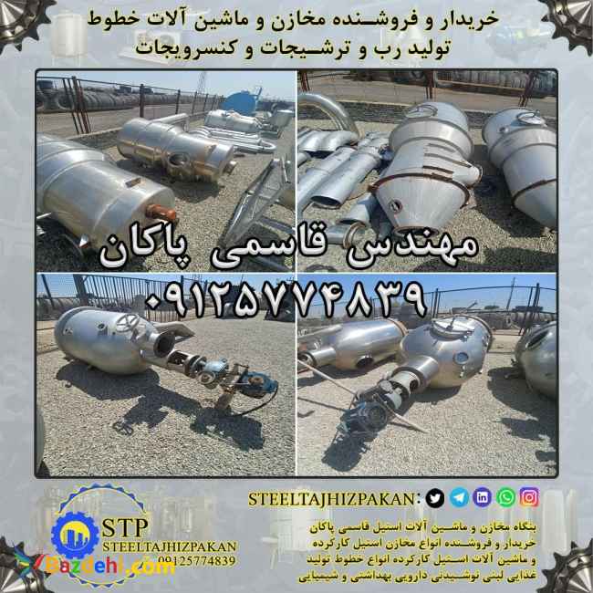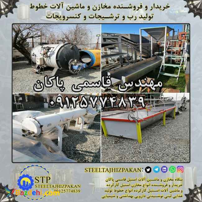 ( فروش خط کامل کارخانه تولید رب و مربا و کنسرویجات و بسته بندی حبوبات ) شامل ماشین آلات و تجهیزات و اقلام زیر : 1/بچ تغلیظ تحت خلا 3 تنی 2 عدد با متعلقات کامل 2/بچ تغلیظ تحت خلا 2 تنی 1 عدد با متعلقات کامل 3/بچ تغلیظ تحت خلا 1 تنی 1 عدد با متعلقات کامل 4/بچ کانتینیوس 200 تنی 2 عدد با متعلقات کامل 5/متعلقات شامل سکو شاسی.راه پله.کندانسور.پمپ وکیوم.پمپ آب.همزن.دینام گیربکس.شیرآلات و اتصالات مربوطه 6/پاستور تونلی 1 عدد 7/پاستور لوله ای 2 عدد و پری هیتر 2 عدد 8/سورتینگ شستشو 1 عدد 9/وان دریافت محصول 1 عدد 10/صافی دو مرحله ای 2 عدد 11/مونو پمپ 2 عدد 12/دربند 4 هد روسی 1 عدد 13/دربند مهیاری 1 عدد 14/شیرینگ تونلی 2 عدد 15/سینی ترافیک 2 عدد 16/شربت ساز دو طبقه 2 عدد 17/پرکن دو نازل سیلندر پیستونی مواد غلیظ 2 عدد 18/پاتیل گردان 2 عدد 19/مخزن استیل نمک زنی 1000 و 3000 لیتری 3 عدد 20/مخازن پیش گرم 200 لیتری 4 عدد 21/مخزن تکجدار روباز استیل 500 لیتری 1 عدد 22/مخزن استیل تکجدار 150 لیتری کوئل دار 1 عدد 23/تانکر های گالوانیزه گازوییل 8 عدد 24/اتوکلاو ایستاده 3 عدد 25/دیگ بخار 5 تن سوپر اکتیو 1 عدد 26/دیگ بخار 3 تن اراک 1 عدد 27/دستگاه پرکن دو توزین 1 عدد 28/دستگاه بوجاری 1 عدد 29/قیف سیلو دریافت مواد 1 عدد 30/نوار نقاله استیل دو متری با مخزن محلول ریز 1 عدد 31/نوار نقاله تسمه لاستیکی دو متری 3 عدد 32/نوار نقاله استیل دو متری با نازل محلول ریز 1 عدد 33/نوار نقاله استیل یک و نیم متری 1 عدد 34/میز استیل 4 عدد 35/پرکن روتاری لوبیا 1 عدد 36/تونل حباب گیر شیشه ترشی تمان استیل شش متری 1 عدد 37/نوار نقاله 20 سانتی استیل دو متری 1 عدد 38/نوار نقاله 30 سانتی تسمه لاستیکی پایه استیل چهار متری 1 عدد 39/وان 200 لیتری 4 گوش 1 عدد 40/وان شستشو میوه فرچه ای دو متری با نوار نقاله دو متری سورتر 1 عدد 41/دم گیر گیلاس و آلبالو 42/سازه فلزی به وزن 4 تن 43/تعداد 120 هزار عدد قوطی یک کیلویی چاپ خورده با درب ایزی اوپن همگی سالم و تمیز بدون زنگ و لک زدگی بسته بندی به صورت استرچ پالت شده 44/مقدار زیادی کارتون بسته بندی بازیافتی 45/تعداد زیادی بشکه های پلاستیکی آبی رنگ مهندس قاسمی پاکان 09125774839 (بنگاه مخازن و ماشین آلات استیل قاسمی پاکان)(استیل تجهیز پاکان) (((مخازن استیل تجهیزات و ماشین آلات استیل لبنی نوشیدنی غذایی دارویی آرایشی بهداشتی شیمیایی جهت بازدید موجود میباشد)))