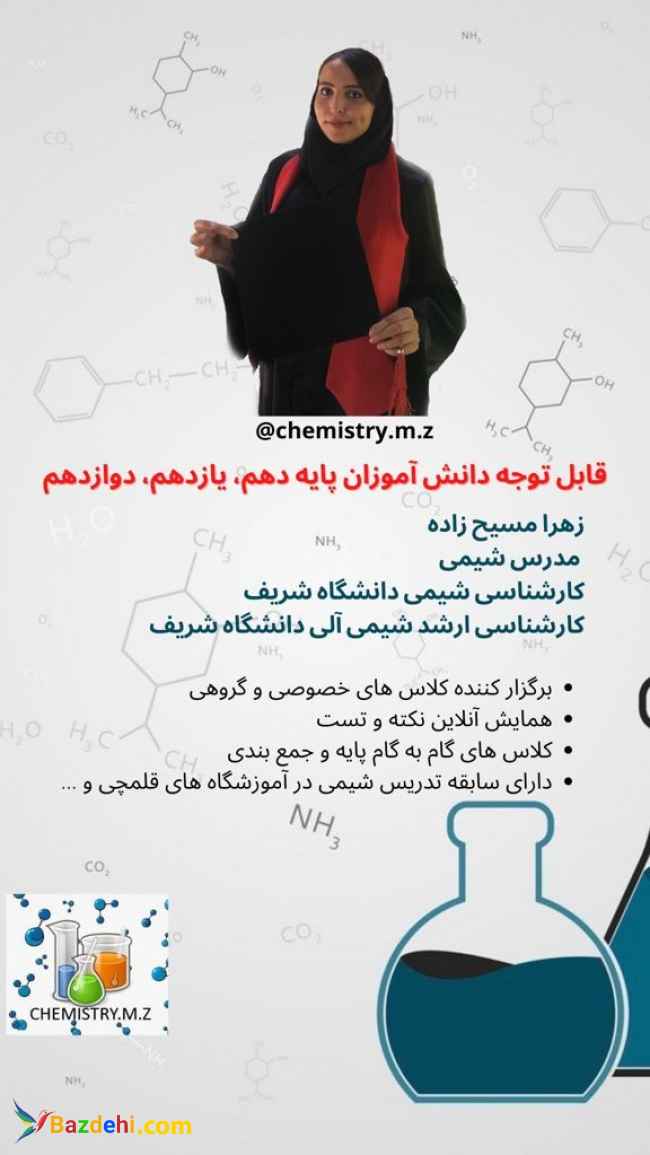 من زهرا مسیح زاده هستم من مقطع کارشناسی رشته شیمی کاربردی را در دانشگاه صنعتی شریف گذرانده ام و هم اکنون دانشجوی ارشد شیمی آلی در همان دانشگاه هستم.شیمی را از پایه تا کنکور به شما با روش های جدید و منابع متفاوت با توجه به نیاز شما دانش آموزان آموزش خواهم داد هزینه توافقی اینستاگرام:chemistry.m.z