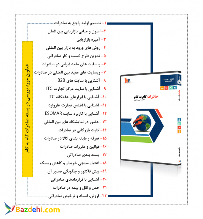 عناوین مورد بررسی در این بسته: - تصمیم اولیه راجع به صادرات - اصول و مبانی بازاریابی بین الملل - آمیزه بازاریابی - روش های ورود به بازار بین المللی - تدوین طرح کسب و کار صادراتی - وبسایت های مفید ایرانی در صادرات - وبسایت های مفید بین المللی در صادرات - آشنایی با سایت های B2B - آشنایی با سایت مرکز تجارت ITC - آشنایی با ابزارهای هفتگانه ITC - آشنایی با اطلس تجارت هاروارد - آشنایی با کاربرد سایت ESOMAR - حضور در نمایشگاه های بین المللی - کارت بازرگانی در صادرات - تعرفه و طبقه بندی کالا در صادرات - قوانین و مقررات صادرات - بسته بندی صادراتی - اعتبار سنجی خریدار و کاهش ریسک - پیش فاکتور و چگونگی صدور آن - آشنایی با قراردادهای صادراتی - حمل و نقل و بیمه در صادرات - ارزش، اسناد و ترخیص صادراتی