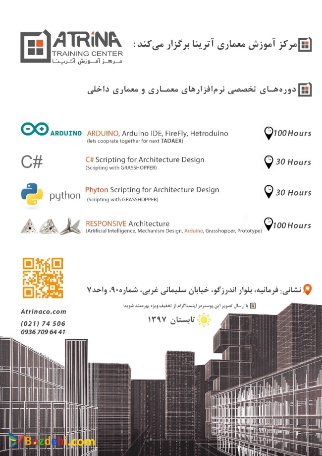 آموزش- معماری- معماری داخلی- طراحی، نظارت و اجرا- نرم افزار- تری دی مکس- راینو- گرس هاپر- آردینو- پرزانته دیجیتال- پست پروداکشن- عکاسی- هترودیونو