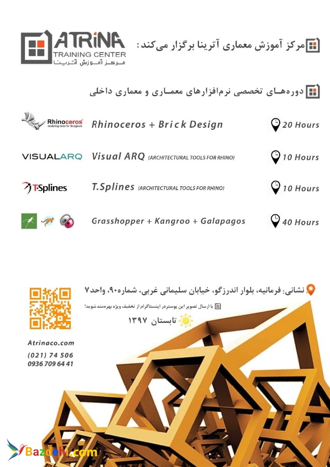 آموزش- معماری- معماری داخلی- طراحی، نظارت و اجرا- نرم افزار- تری دی مکس- راینو- گرس هاپر- آردینو- پرزانته دیجیتال- پست پروداکشن- عکاسی- هترودیونو
