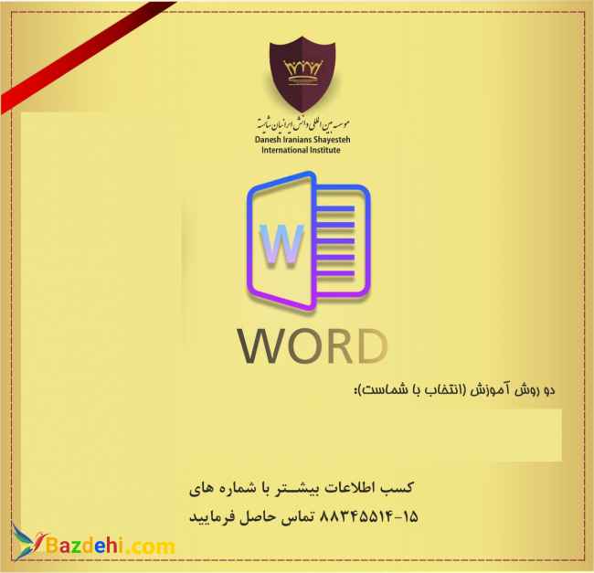آموزش غیرحضوری ورد word در این بسته آموزشی با محیط ورد آشنا شده و گزینه های آنرا همراه مثال و تمرین آموزش میبینید کادر بندی شماره گذاری صفحات فهرست نویسی ارتباط اکسل و word و غیره جهت کسب بسته اموزشی با شماره های ذیل تماس حاصل نمایید. 88345514 88345515 موسسه بین المللی دانش ایرانیان شایسته
