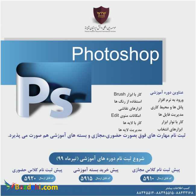 آموزش فتوشاپ به صورت غیرحضوری بوده در این بسته شما با محیط نرم افزار اشنا می شوید و بازار های مختلف آنرا اموزش میبینید جهت دریافت بسته آموزشی با شماره های ذیل تماس حاصل نمایید. 88345514 88345515 موسسه بین المللی دانش ایرانیان شایسته