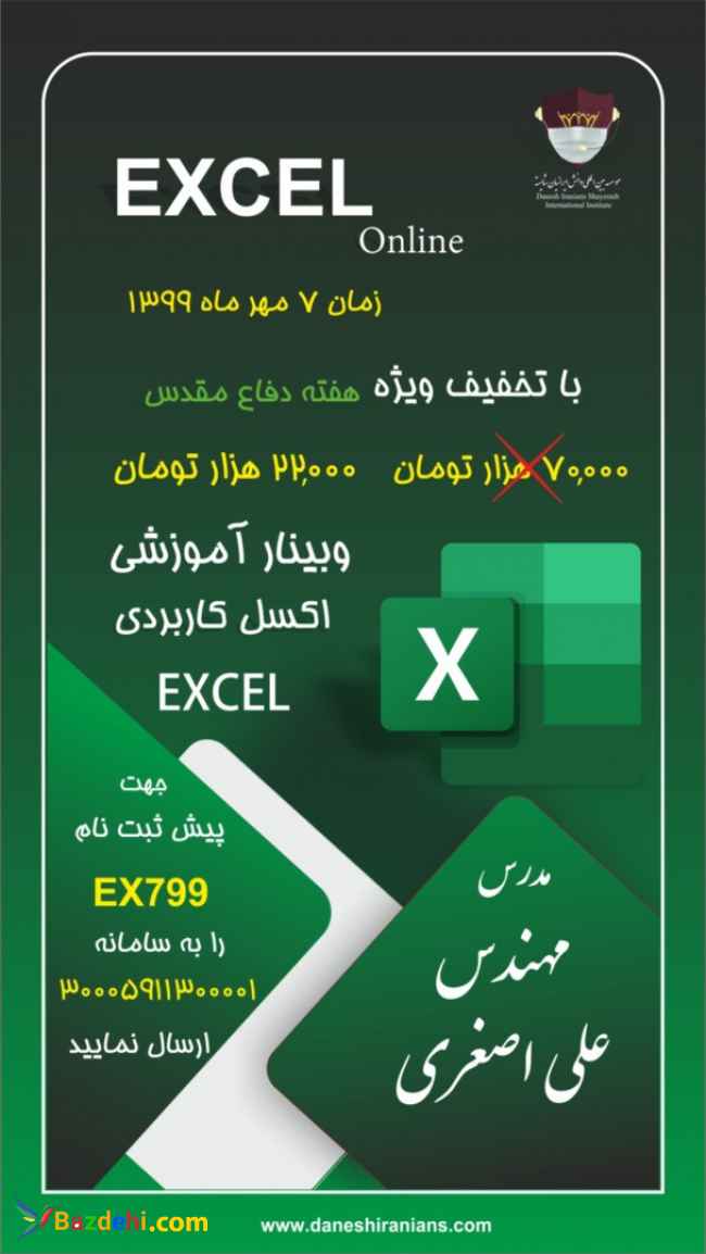 EXCEL online وبینار آموزشی اکسل کاربردی قیمت وبینار 70 هزار تومان با تخفیف ویژه هفته دفاع مقدس، 22 هزار تومان جهت پیش ثبت نام EX799 را به سامانه 30005911300001 ارسال نمایید. مدرس علی اصغری